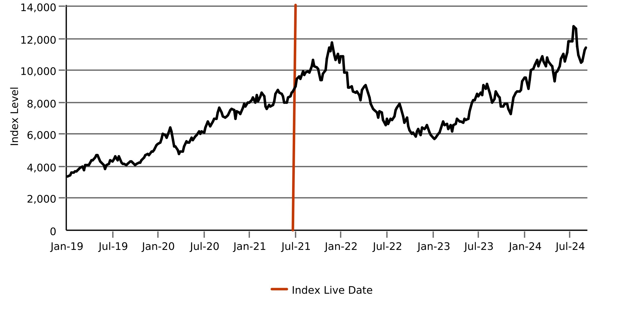 The following graph sets forth the hypothetical back-tested performance of the Index based on the hypothetical back-tested weekly closing levels of the Index from January 4, 2019 through June 18, 2021, and the historical performance of the Index based on the weekly historical closing levels of the Index from June 25, 2021 through August 23, 2024. The Index was established on June 22, 2021, as represented by the vertical line in the following graph. All data to the left of that vertical line reflect hypothetical back-tested performance of the Index. All data to the right of that vertical line reflect actual historical performance of the Index. The closing level of the Index on August 27, 2024 was 11,271.75. We obtained the closing levels above and below from the Bloomberg Professional® service ("Bloomberg"), without independent verification.