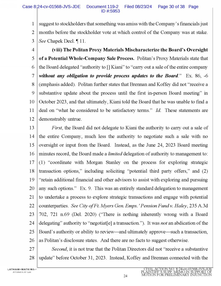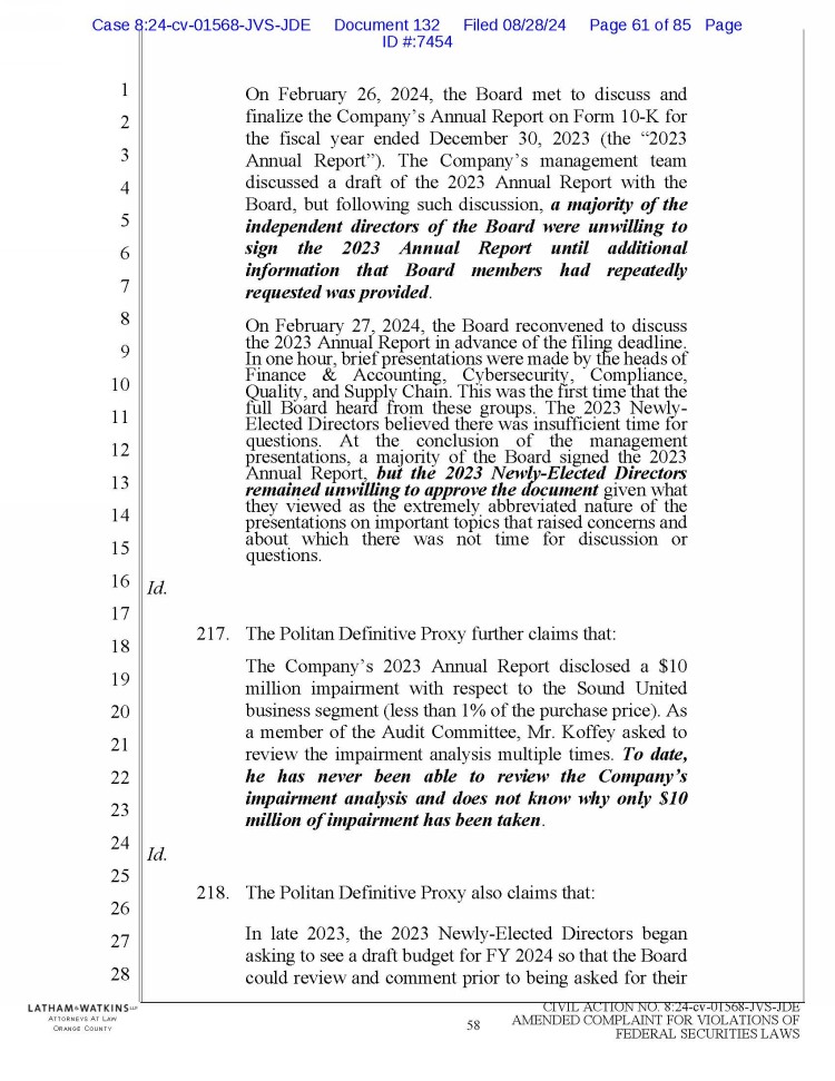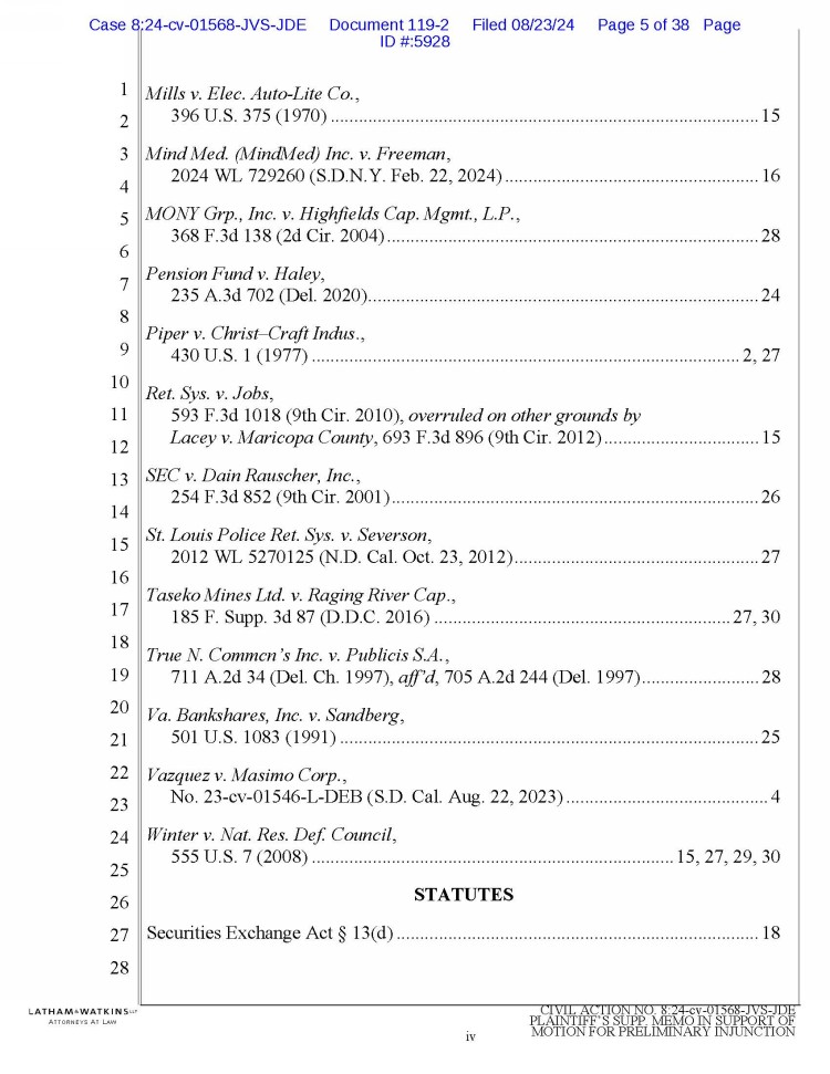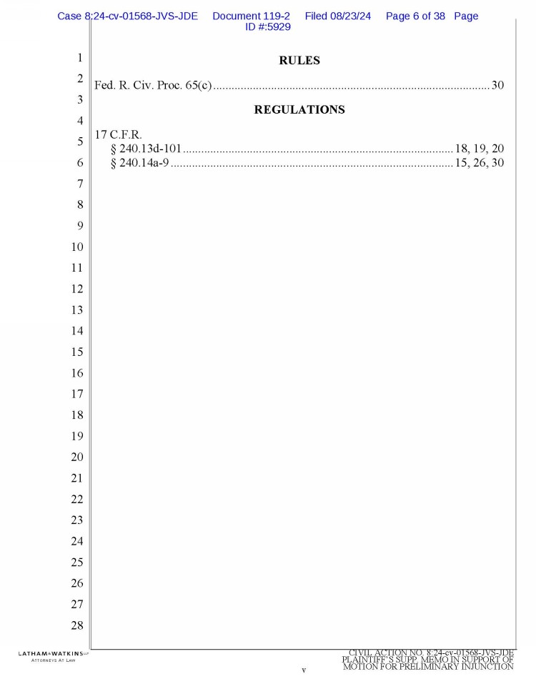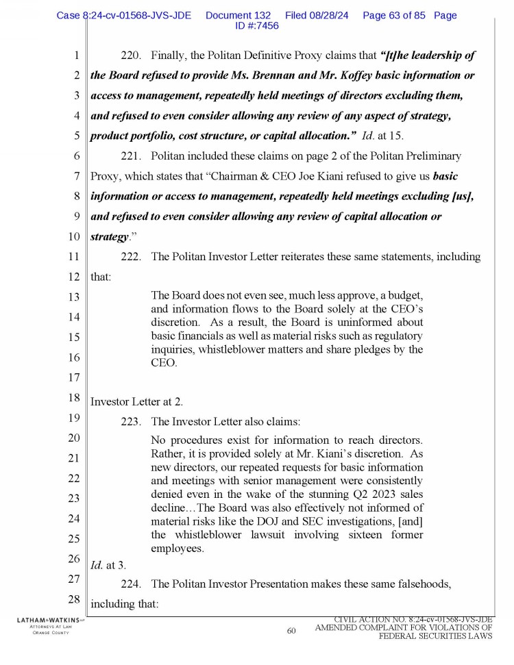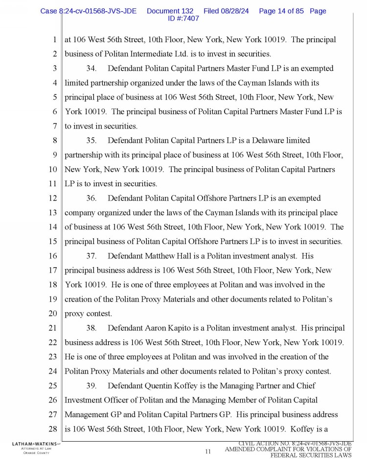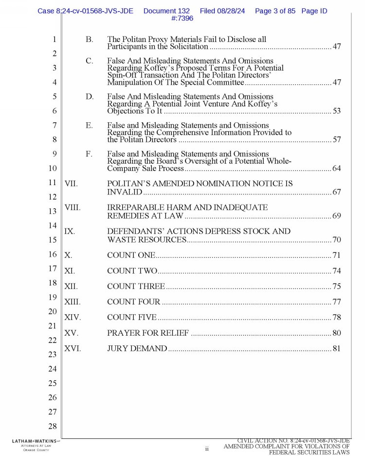 On August 23, 2024, the Issuer filed a Supplemented Memorandum of Points & Authorities in Support of Motion for Preliminary Injunction (the “Preliminary Injunction Motion”) in the United States District Court for the Central District of California. The Preliminary Injunction Motion seeks an order from the court enjoining Mr. Koffey and Politan from voting any proxies solicited by them in violation of Section 14(a) of the Act until corrective disclosures are made. The Preliminary Injunction Motion is qualified in its entirety by reference to Exhibit 99.16, which is attached hereto and is incorporated herein by reference.