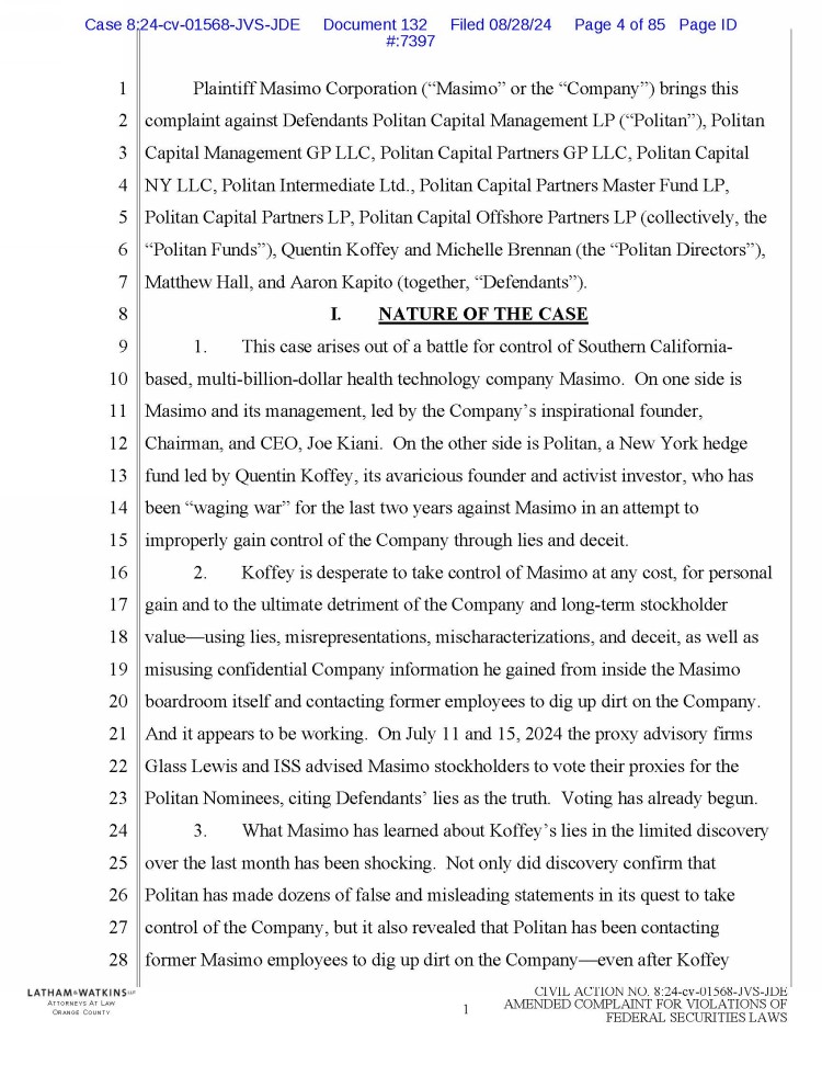 This Amendment No. 14 to Schedule 13D (this “Amendment No. 14”) amends and supplements the Schedule 13D filed on August 16, 2022 (as amended and supplemented through the date of this Amendment No. 14, collectively, the “Schedule 13D”) by the Reporting Persons, relating to the common stock, par value $0.001 per share, of Masimo Corporation, a Delaware corporation (the “Issuer”). Capitalized terms not defined in this Amendment No. 14 shall have the meaning ascribed to them in the Schedule 13D.