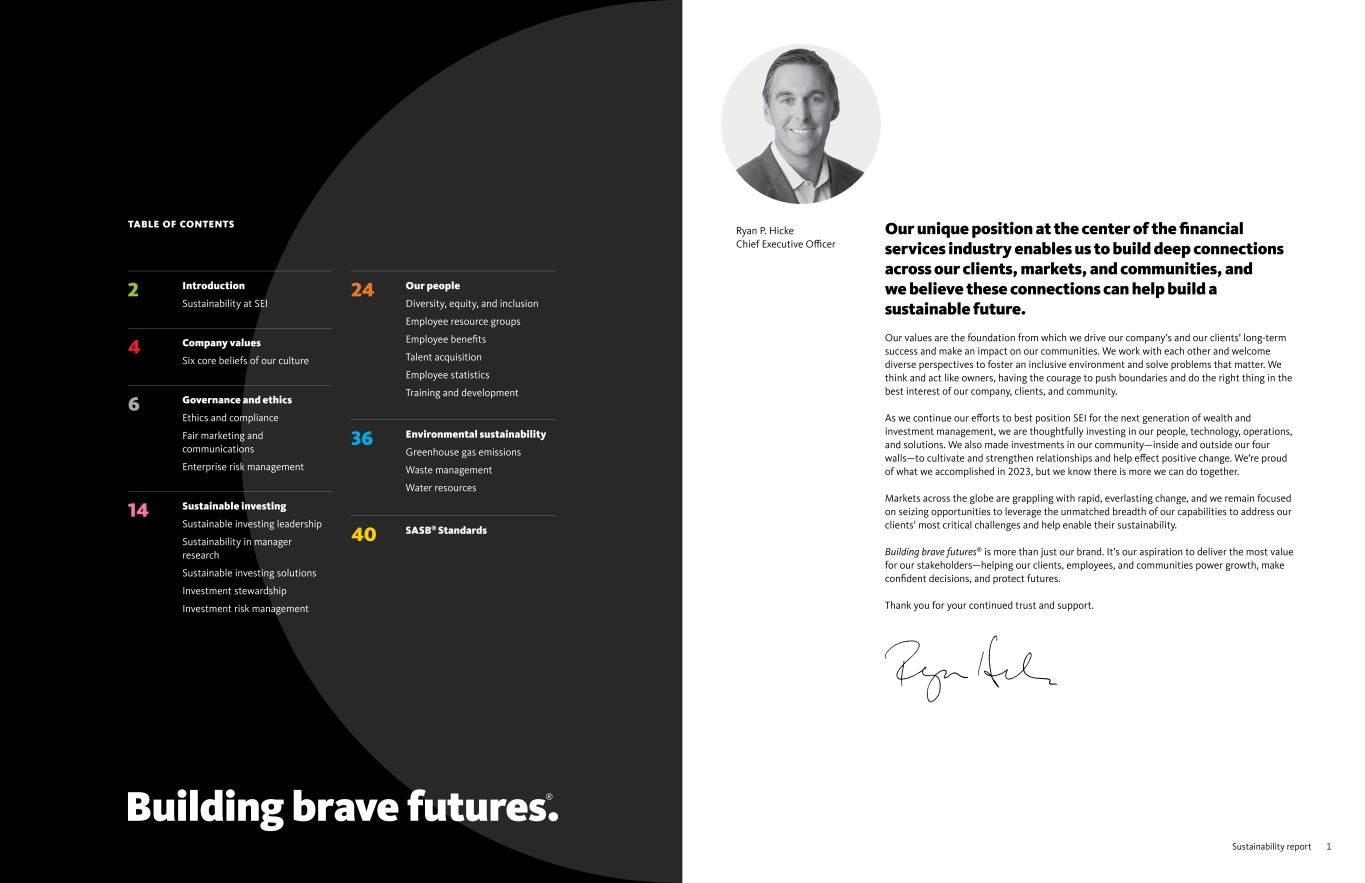 1Sustainability reportB Sustainability report Our unique position at the center of the financial services industry enables us to build deep connections across our clients, markets, and communities, and we believe these connections can help build a sustainable future. Our values are the foundation from which we drive our company’s and our clients’ long-term success and make an impact on our communities. We work with each other and welcome diverse perspectives to foster an inclusive environment and solve problems that matter. We think and act like owners, having the courage to push boundaries and do the right thing in the best interest of our company, clients, and community. As we continue our efforts to best position SEI for the next generation of wealth and investment management, we are thoughtfully investing in our people, technology, operations, and solutions. We also made investments in our community—inside and outside our four walls—to cultivate and strengthen relationships and help effect positive change. We’re proud of what we accomplished in 2023, but we know there is more we can do together. Markets across the globe are grappling with rapid, everlasting change, and we remain focused on seizing opportunities to leverage the unmatched breadth of our capabilities to address our clients’ most critical challenges and help enable their sustainability. Building brave futures® is more than just our brand. It’s our aspiration to deliver the most value for our stakeholders—helping our clients, employees, and communities power growth, make confident decisions, and protect futures. Thank you for your continued trust and support. Ryan P. Hicke Chief Executive Officer TABLE OF CONTENTS 2 Introduction Sustainability at SEI 4 Company values Six core beliefs of our culture 6 Governance and ethics Ethics and compliance Fair marketing and communications Enterprise risk management 14 Sustainable investing Sustainable investing leadership Sustainability in manager research Sustainable investing solutions Investment stewardship Investment risk management 24 Our people Diversity, equity, and inclusion Employee resource groups Employee benefits Talent acquisition Employee statistics Training and development 36 Environmental sustainability Greenhouse gas emissions Waste management Water resources 40 SASB® Standards