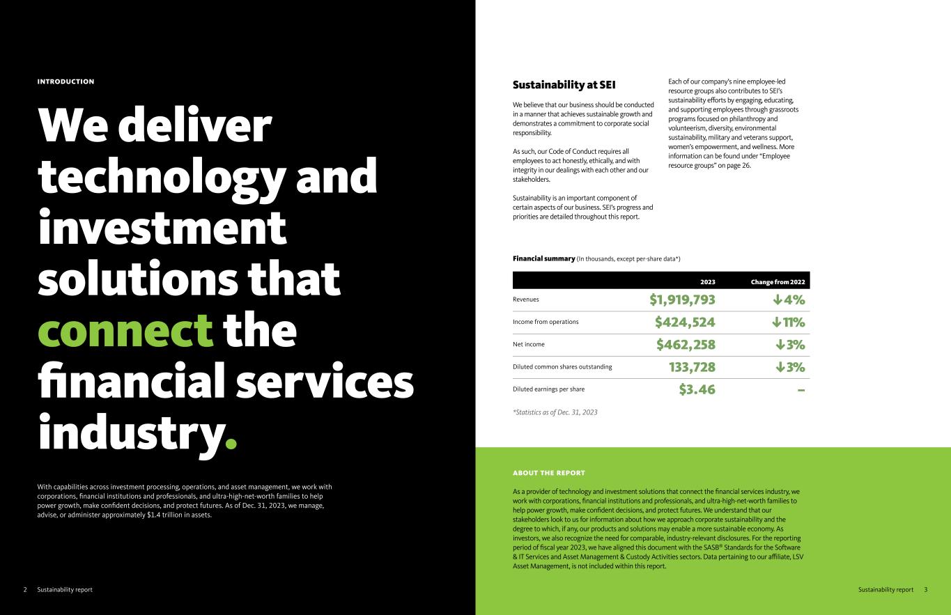 2 Sustainability report 3Sustainability report INTRODUCTION We deliver technology and investment solutions that connect the financial services industry. With capabilities across investment processing, operations, and asset management, we work with corporations, financial institutions and professionals, and ultra-high-net-worth families to help power growth, make confident decisions, and protect futures. As of Dec. 31, 2023, we manage, advise, or administer approximately $1.4 trillion in assets. Sustainability at SEI We believe that our business should be conducted in a manner that achieves sustainable growth and demonstrates a commitment to corporate social responsibility. As such, our Code of Conduct requires all employees to act honestly, ethically, and with integrity in our dealings with each other and our stakeholders. Sustainability is an important component of certain aspects of our business. SEI’s progress and priorities are detailed throughout this report. Each of our company’s nine employee-led resource groups also contributes to SEI’s sustainability efforts by engaging, educating, and supporting employees through grassroots programs focused on philanthropy and volunteerism, diversity, environmental sustainability, military and veterans support, women’s empowerment, and wellness. More information can be found under “Employee resource groups” on page 26. Financial summary (In thousands, except per-share data*) 2023 Change from 2022 Revenues $1,919,793 4% Income from operations $424,524 11% Net income $462,258 3% Diluted common shares outstanding 133,728 3% Diluted earnings per share $3.46 – *Statistics as of Dec. 31, 2023 ABOUT THE REPORT As a provider of technology and investment solutions that connect the financial services industry, we work with corporations, financial institutions and professionals, and ultra-high-net-worth families to help power growth, make confident decisions, and protect futures. We understand that our stakeholders look to us for information about how we approach corporate sustainability and the degree to which, if any, our products and solutions may enable a more sustainable economy. As investors, we also recognize the need for comparable, industry-relevant disclosures. For the reporting period of fiscal year 2023, we have aligned this document with the SASB® Standards for the Software & IT Services and Asset Management & Custody Activities sectors. Data pertaining to our affiliate, LSV Asset Management, is not included within this report.