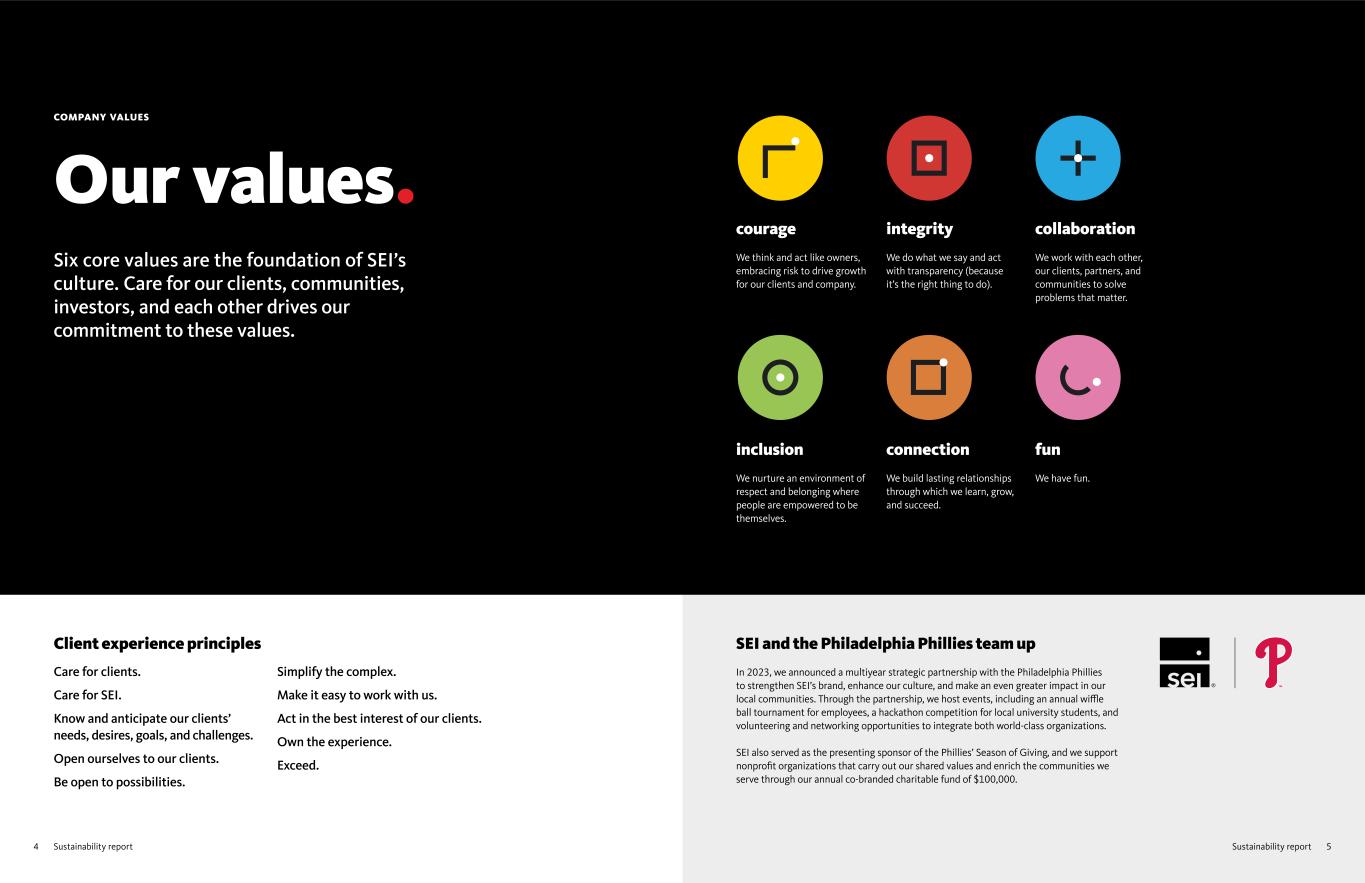 4 Sustainability report COMPANY VALUES Our values. Six core values are the foundation of SEI’s culture. Care for our clients, communities, investors, and each other drives our commitment to these values. Client experience principles Care for clients. Care for SEI. Know and anticipate our clients’ needs, desires, goals, and challenges. Open ourselves to our clients. Be open to possibilities. Simplify the complex. Make it easy to work with us. Act in the best interest of our clients. Own the experience. Exceed. courage We think and act like owners, embracing risk to drive growth for our clients and company. integrity We do what we say and act with transparency (because it’s the right thing to do). collaboration We work with each other, our clients, partners, and communities to solve problems that matter. inclusion We nurture an environment of respect and belonging where people are empowered to be themselves. connection We build lasting relationships through which we learn, grow, and succeed. fun We have fun. SEI and the Philadelphia Phillies team up In 2023, we announced a multiyear strategic partnership with the Philadelphia Phillies to strengthen SEI’s brand, enhance our culture, and make an even greater impact in our local communities. Through the partnership, we host events, including an annual wiffle ball tournament for employees, a hackathon competition for local university students, and volunteering and networking opportunities to integrate both world-class organizations. SEI also served as the presenting sponsor of the Phillies’ Season of Giving, and we support nonprofit organizations that carry out our shared values and enrich the communities we serve through our annual co-branded charitable fund of $100,000. 5Sustainability report