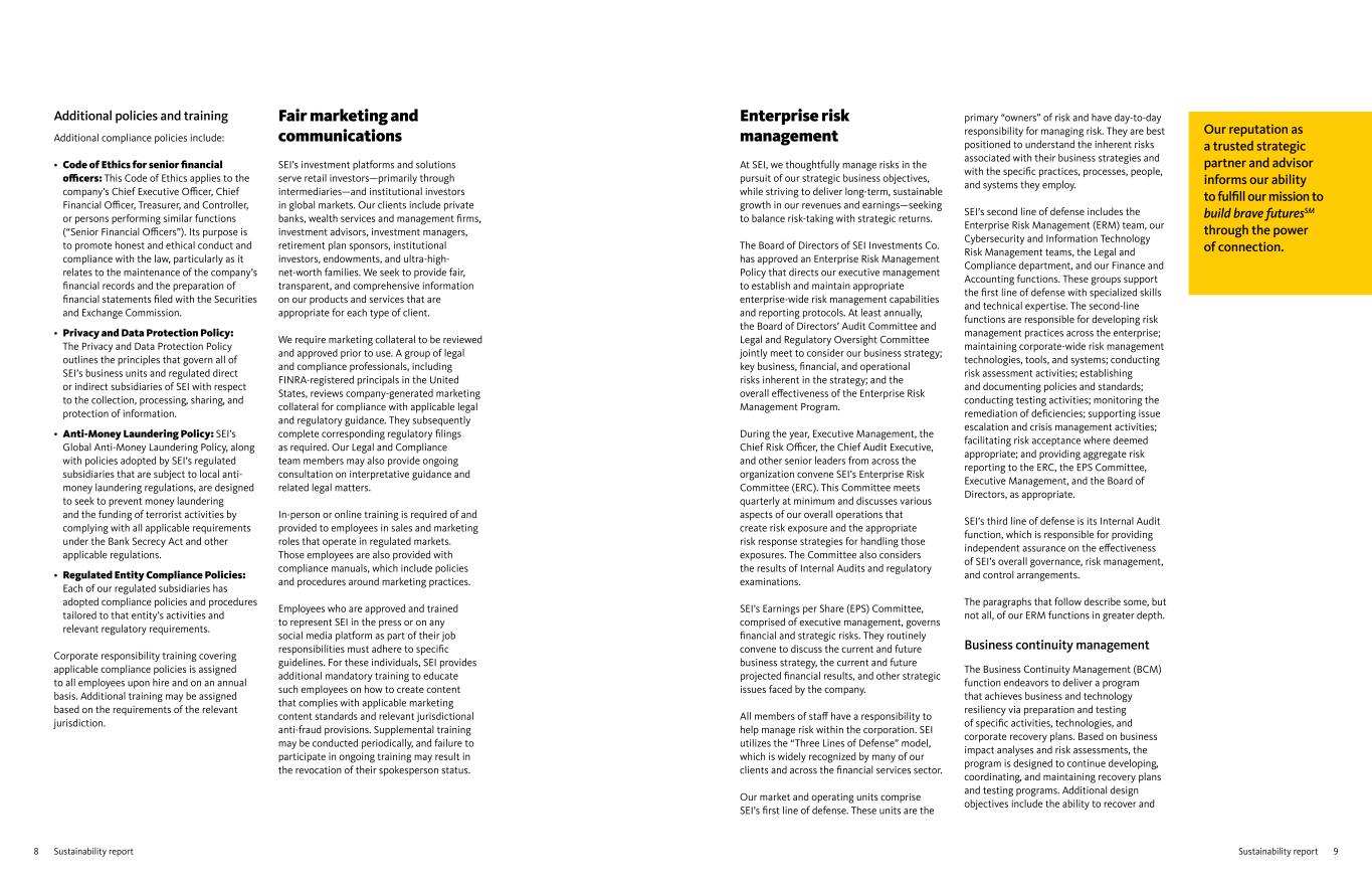 9Sustainability report8 Sustainability report Enterprise risk management At SEI, we thoughtfully manage risks in the pursuit of our strategic business objectives, while striving to deliver long-term, sustainable growth in our revenues and earnings—seeking to balance risk-taking with strategic returns. The Board of Directors of SEI Investments Co. has approved an Enterprise Risk Management Policy that directs our executive management to establish and maintain appropriate enterprise-wide risk management capabilities and reporting protocols. At least annually, the Board of Directors’ Audit Committee and Legal and Regulatory Oversight Committee jointly meet to consider our business strategy; key business, financial, and operational risks inherent in the strategy; and the overall effectiveness of the Enterprise Risk Management Program. During the year, Executive Management, the Chief Risk Officer, the Chief Audit Executive, and other senior leaders from across the organization convene SEI’s Enterprise Risk Committee (ERC). This Committee meets quarterly at minimum and discusses various aspects of our overall operations that create risk exposure and the appropriate risk response strategies for handling those exposures. The Committee also considers the results of Internal Audits and regulatory examinations. SEI’s Earnings per Share (EPS) Committee, comprised of executive management, governs financial and strategic risks. They routinely convene to discuss the current and future business strategy, the current and future projected financial results, and other strategic issues faced by the company. All members of staff have a responsibility to help manage risk within the corporation. SEI utilizes the “Three Lines of Defense” model, which is widely recognized by many of our clients and across the financial services sector. Our market and operating units comprise SEI’s first line of defense. These units are the Additional policies and training Additional compliance policies include: • Code of Ethics for senior financial officers: This Code of Ethics applies to the company’s Chief Executive Officer, Chief Financial Officer, Treasurer, and Controller, or persons performing similar functions (“Senior Financial Officers”). Its purpose is to promote honest and ethical conduct and compliance with the law, particularly as it relates to the maintenance of the company’s financial records and the preparation of financial statements filed with the Securities and Exchange Commission. • Privacy and Data Protection Policy: The Privacy and Data Protection Policy outlines the principles that govern all of SEI’s business units and regulated direct or indirect subsidiaries of SEI with respect to the collection, processing, sharing, and protection of information. • Anti-Money Laundering Policy: SEI’s Global Anti-Money Laundering Policy, along with policies adopted by SEI’s regulated subsidiaries that are subject to local anti- money laundering regulations, are designed to seek to prevent money laundering and the funding of terrorist activities by complying with all applicable requirements under the Bank Secrecy Act and other applicable regulations. • Regulated Entity Compliance Policies: Each of our regulated subsidiaries has adopted compliance policies and procedures tailored to that entity’s activities and relevant regulatory requirements. Corporate responsibility training covering applicable compliance policies is assigned to all employees upon hire and on an annual basis. Additional training may be assigned based on the requirements of the relevant jurisdiction. primary “owners” of risk and have day-to-day responsibility for managing risk. They are best positioned to understand the inherent risks associated with their business strategies and with the specific practices, processes, people, and systems they employ. SEI’s second line of defense includes the Enterprise Risk Management (ERM) team, our Cybersecurity and Information Technology Risk Management teams, the Legal and Compliance department, and our Finance and Accounting functions. These groups support the first line of defense with specialized skills and technical expertise. The second-line functions are responsible for developing risk management practices across the enterprise; maintaining corporate-wide risk management technologies, tools, and systems; conducting risk assessment activities; establishing and documenting policies and standards; conducting testing activities; monitoring the remediation of deficiencies; supporting issue escalation and crisis management activities; facilitating risk acceptance where deemed appropriate; and providing aggregate risk reporting to the ERC, the EPS Committee, Executive Management, and the Board of Directors, as appropriate. SEI’s third line of defense is its Internal Audit function, which is responsible for providing independent assurance on the effectiveness of SEI’s overall governance, risk management, and control arrangements. The paragraphs that follow describe some, but not all, of our ERM functions in greater depth. Business continuity management The Business Continuity Management (BCM) function endeavors to deliver a program that achieves business and technology resiliency via preparation and testing of specific activities, technologies, and corporate recovery plans. Based on business impact analyses and risk assessments, the program is designed to continue developing, coordinating, and maintaining recovery plans and testing programs. Additional design objectives include the ability to recover and Fair marketing and communications SEI’s investment platforms and solutions serve retail investors—primarily through intermediaries—and institutional investors in global markets. Our clients include private banks, wealth services and management firms, investment advisors, investment managers, retirement plan sponsors, institutional investors, endowments, and ultra-