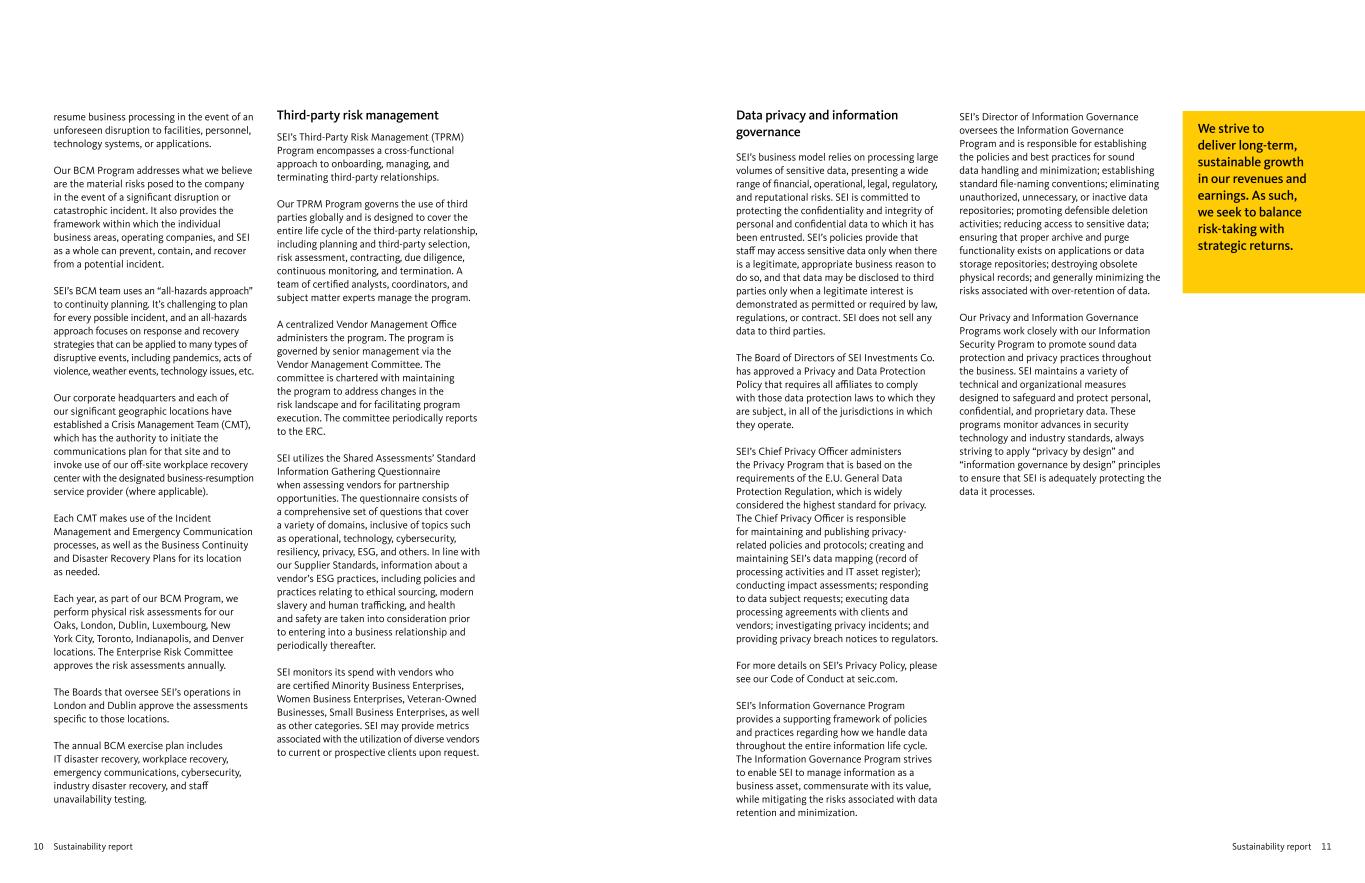 11Sustainability report10 Sustainability report Data privacy and information governance SEI’s business model relies on processing large volumes of sensitive data, presenting a wide range of financial, operational, legal, regulatory, and reputational risks. SEI is committed to protecting the confidentiality and integrity of personal and confidential data to which it has been entrusted. SEI’s policies provide that staff may access sensitive data only when there is a legitimate, appropriate business reason to do so, and that data may be disclosed to third parties only when a legitimate interest is demonstrated as permitted or required by law, regulations, or contract. SEI does not sell any data to third parties. The Board of Directors of SEI Investments Co. has approved a Privacy and Data Protection Policy that requires all affiliates to comply with those data protection laws to which they are subject, in all of the jurisdictions in which they operate. SEI’s Chief Privacy Officer administers the Privacy Program that is based on the requirements of the E.U. General Data Protection Regulation, which is widely considered the highest standard for privacy. The Chief Privacy Officer is responsible for maintaining and publishing privacy- related policies and protocols; creating and maintaining SEI’s data mapping (record of processing activities and IT asset register); conducting impact assessments; responding to data subject requests; executing data processing agreements with clients and vendors; investigating privacy incidents; and providing privacy breach notices to regulators. For more details on SEI’s Privacy Policy, please see our Code of Conduct at seic.com. SEI’s Information Governance Program provides a supporting framework of policies and practices regarding how we handle data throughout the entire information life cycle. The Information Governance Program strives to enable SEI to manage information as a business asset, commensurate with its value, while mitigating the risks associated with data retention and minimization. resume business processing in the event of an unforeseen disruption to facilities, personnel, technology systems, or applications. Our BCM Program addresses what we believe are the material risks posed to the company in the event of a significant disruption or catastrophic incident. It also provides the framework within which the individual business areas, operating companies, and SEI as a whole can prevent, contain, and recover from a potential incident. SEI’s BCM team uses an “all-hazards approach” to continuity planning. It’s challenging to plan for every possible incident, and an all-hazards approach focuses on response and recovery strategies that can be applied to many types of disruptive events, including pandemics, acts of violence, weather events, technology issues, etc. Our corporate headquarters and each of our significant geographic locations have established a Crisis Management Team (CMT), which has the authority to initiate the communications plan for that site and to invoke use of our off-site workplace recovery center with the designated business-resumption service provider (where applicable). Each CMT makes use of the Incident Management and Emergency Communication processes, as well as the Business Continuity and Disaster Recovery Plans for its location as needed. Each year, as part of our BCM Program, we perform physical risk assessments for our Oaks, London, Dublin, Luxembourg, New York City, Toronto, Indianapolis, and Denver locations. The Enterprise Risk Committee approves the risk assessments annually. The Boards that oversee SEI’s operations in London and Dublin approve the assessments specific to those locations. The annual BCM exercise plan includes IT disaster recovery, workplace recovery, emergency communications, cybersecurity, industry disaster recovery, and staff unavailability testing. SEI’s Director of Information Governance oversees the Information Governance Program and is responsible for establishing the policies and best practices for sound data handling and minimization; establishing standard file-naming conventions; eliminating unauthorized, unnecessary, or inactive data repositories; promoting defensible deletion activities; reducing access to sensitive data; ensuring that proper archive and purge functionality exists on applications or data storage repositories; destroying obsolete physical records; and generally minimizing the risks associated with over-retention of data. Our Privacy and Information Governance Programs work closely with our Information Security Program to promote sound data protection and privacy practices throughout the business. SEI maintains a variety of technical and organizational measures designed to safeguard and protect personal, confidential, and proprietary data. These programs monitor advances in security technology and industry standards, always striving to apply “privacy by design” and “information governance by design” principles to ensure that SEI is adequately protecting the data it processes. Third-party risk management SEI’s Third-Party Risk Management (TPRM) Program encompasses a cross-functional approach to onboarding, managing, and terminating third-party relationships. Our TPRM Program governs the use of third parties globally and is designed to cover the entire life cycle of the third-party relationship, including planning and third-party selection, risk assessment, contracting, due diligence, continuous monitoring, and termination. A team of certified analysts, coordinators, and subject matter experts manage the program. A centralized Vendor Management Office administers the program. The program is governed by senior management via the Vendor Management Committee. The committee is chartered with maintaining the program to address changes in the risk landscape and for facilitating program execution. The committee periodically reports to the ERC. SEI utiliz