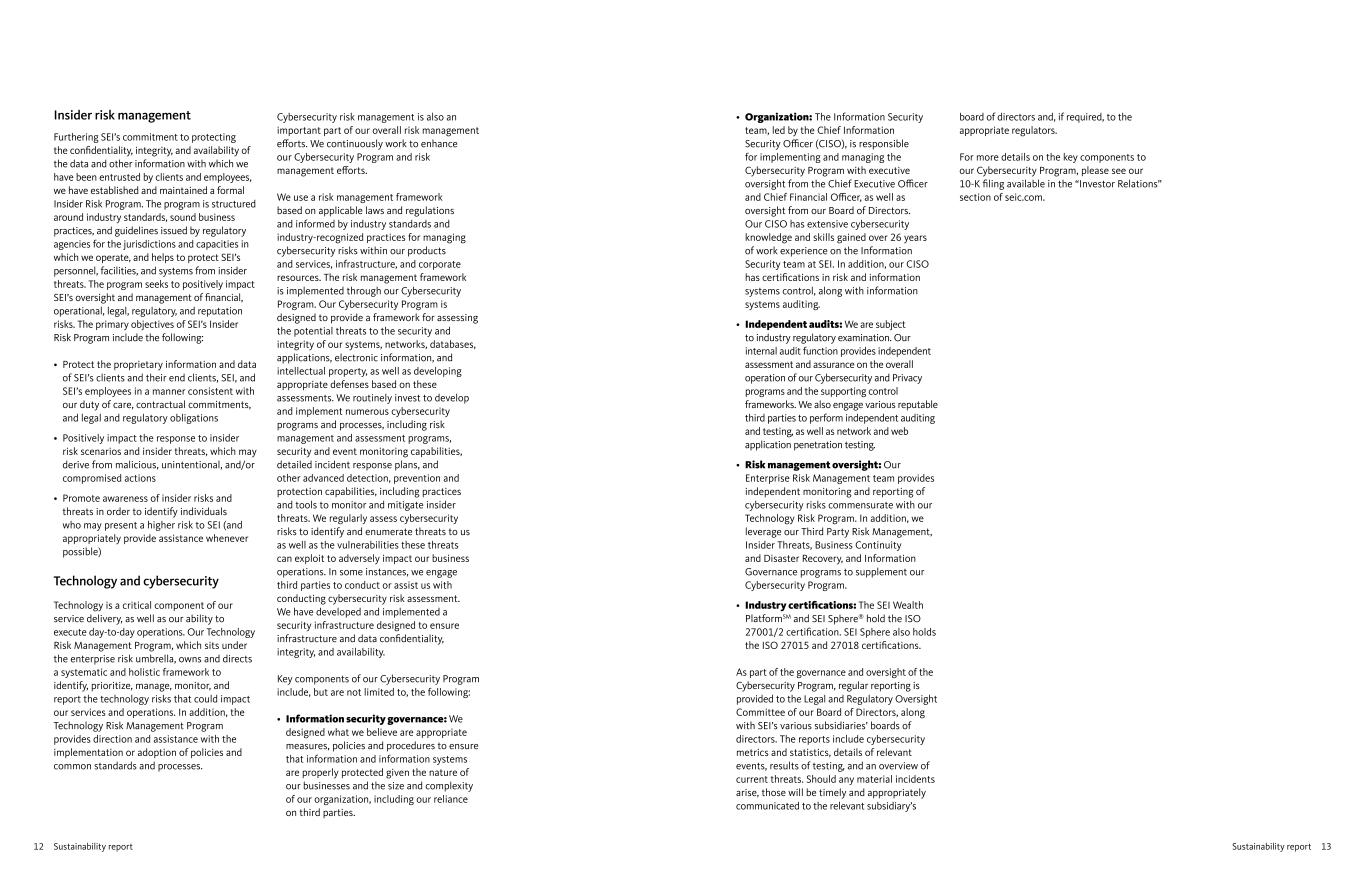 13Sustainability report12 Sustainability report • Organization: The Information Security team, led by the Chief Information Security Officer (CISO), is responsible for implementing and managing the Cybersecurity Program with executive oversight from the Chief Executive Officer and Chief Financial Officer, as well as oversight from our Board of Directors. Our CISO has extensive cybersecurity knowledge and skills gained over 26 years of work experience on the Information Security team at SEI. In addition, our CISO has certifications in risk and information systems control, along with information systems auditing. • Independent audits: We are subject to industry regulatory examination. Our internal audit function provides independent assessment and assurance on the overall operation of our Cybersecurity and Privacy programs and the supporting control frameworks. We also engage various reputable third parties to perform independent auditing and testing, as well as network and web application penetration testing. • Risk management oversight: Our Enterprise Risk Management team provides independent monitoring and reporting of cybersecurity risks commensurate with our Technology Risk Program. In addition, we leverage our Third Party Risk Management, Insider Threats, Business Continuity and Disaster Recovery, and Information Governance programs to supplement our Cybersecurity Program. • Industry certifications: The SEI Wealth PlatformSM and SEI Sphere® hold the ISO 27001/2 certification. SEI Sphere also holds the ISO 27015 and 27018 certifications. As part of the governance and oversight of the Cybersecurity Program, regular reporting is provided to the Legal and Regulatory Oversight Committee of our Board of Directors, along with SEI’s various subsidiaries’ boards of directors. The reports include cybersecurity metrics and statistics, details of relevant events, results of testing, and an overview of current threats. Should any material incidents arise, those will be timely and appropriately communicated to the relevant subsidiary’s Insider risk management Furthering SEI’s commitment to protecting the confidentiality, integrity, and availability of the data and other information with which we have been entrusted by clients and employees, we have established and maintained a formal Insider Risk Program. The program is structured around industry standards, sound business practices, and guidelines issued by regulatory agencies for the jurisdictions and capacities in which we operate, and helps to protect SEI’s personnel, facilities, and systems from insider threats. The program seeks to positively impact SEI’s oversight and management of financial, operational, legal, regulatory, and reputation risks. The primary objectives of SEI’s Insider Risk Program include the following: • Protect the proprietary information and data of SEI’s clients and their end clients, SEI, and SEI’s employees in a manner consistent with our duty of care, contractual commitments, and legal and regulatory obligations • Positively impact the response to insider risk scenarios and insider threats, which may derive from malicious, unintentional, and/or compromised actions • Promote awareness of insider risks and threats in order to identify individuals who may present a higher risk to SEI (and appropriately provide assistance whenever possible) Technology and cybersecurity Technology is a critical component of our service delivery, as well as our ability to execute day-to-day operations. Our Technology Risk Management Program, which sits under the enterprise risk umbrella, owns and directs a systematic and holistic framework to identify, prioritize, manage, monitor, and report the technology risks that could impact our services and operations. In addition, the Technology Risk Management Program provides direction and assistance with the implementation or adoption of policies and common standards and processes. board of directors and, if required, to the appropriate regulators. For more details on the key components to our Cybersecurity Program, please see our 10-K filing available in the “Investor Relations” section of seic.com. Cybersecurity risk management is also an important part of our overall risk management efforts. We continuously work to enhance our Cybersecurity Program and risk management efforts. We use a risk management framework based on applicable laws and regulations and informed by industry standards and industry-recognized practices for managing cybersecurity risks within our products and services, infrastructure, and corporate resources. The risk management framework is implemented through our Cybersecurity Program. Our Cybersecurity Program is designed to provide a framework for assessing the potential threats to the security and integrity of our systems, networks, databases, applications, electronic information, and intellectual property, as well as developing appropriate defenses based on these assessments. We routinely invest to develop and implement numerous cybersecurity programs and processes, including risk management and assessment programs, security and event monitoring capabilities, detailed incident response plans, and other advanced detection, prevention and protection capabilities, including practices and tools to monitor and mitigate insider threats. We regularly assess cybersecurity risks to identify and enumerate threats to us as well as the vulnerabilities these threats can exploit to adversely impact our business operations. In some instances, we engage third parties to conduct or assist us with conducting cybersecurity risk assessment. We have developed and implemented a security infrastructure designed to ensure infrastructure and data confidentiality, integrity, and availability. Key components of our Cybersecurity Program include, but are not limited to, the following: • Information security governance: We designed what we believe are appropriate