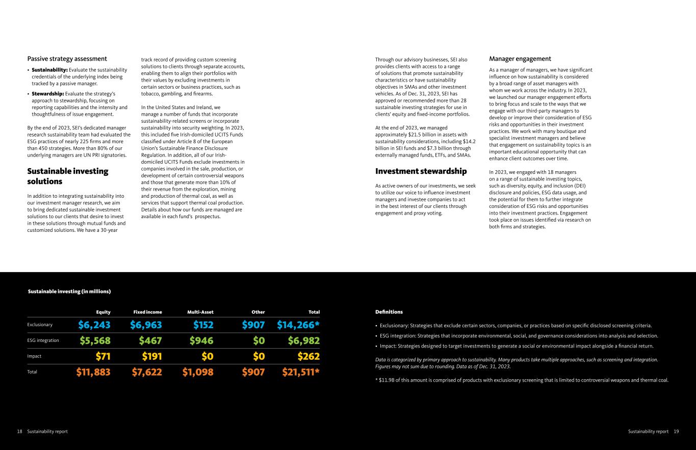 Sustainability report18 19Sustainability report Sustainable investing (in millions) Equity Fixed income Multi-Asset Other Total Exclusionary $6,243 $6,963 $152 $907 $14,266* ESG integration $5,568 $467 $946 $0 $6,982 Impact $71 $191 $0 $0 $262 Total $11,883 $7,622 $1,098 $907 $21,511* Definitions • Exclusionary: Strategies that exclude certain sectors, companies, or practices based on specific disclosed screening criteria. • ESG integration: Strategies that incorporate environmental, social, and governance considerations into analysis and selection. • Impact: Strategies designed to target investments to generate a social or environmental impact alongside a financial return. Data is categorized by primary approach to sustainability. Many products take multiple approaches, such as screening and integration. Figures may not sum due to rounding. Data as of Dec. 31, 2023. * $11.9B of this amount is comprised of products with exclusionary screening that is limited to controversial weapons and thermal coal. Passive strategy assessment • Sustainability: Evaluate the sustainability credentials of the underlying index being tracked by a passive manager. • Stewardship: Evaluate the strategy’s approach to stewardship, focusing on reporting capabilities and the intensity and thoughtfulness of issue engagement. By the end of 2023, SEI’s dedicated manager research sustainability team had evaluated the ESG practices of nearly 225 firms and more than 450 strategies. More than 80% of our underlying managers are UN PRI signatories. Sustainable investing solutions In addition to integrating sustainability into our investment manager research, we aim to bring dedicated sustainable investment solutions to our clients that desire to invest in these solutions through mutual funds and customized solutions. We have a 30-year track record of providing custom screening solutions to clients through separate accounts, enabling them to align their portfolios with their values by excluding investments in certain sectors or business practices, such as tobacco, gambling, and firearms. In the United States and Ireland, we manage a number of funds that incorporate sustainability-related screens or incorporate sustainability into security weighting. In 2023, this included five Irish-domiciled UCITS Funds classified under Article 8 of the European Union’s Sustainable Finance Disclosure Regulation. In addition, all of our Irish- domiciled UCITS Funds exclude investments in companies involved in the sale, production, or development of certain controversial weapons and those that generate more than 10% of their revenue from the exploration, mining and production of thermal coal, as well as services that support thermal coal production. Details about how our funds are managed are available in each fund’s prospectus. Through our advisory businesses, SEI also provides clients with access to a range of solutions that promote sustainability characteristics or have sustainability objectives in SMAs and other investment vehicles. As of Dec. 31, 2023, SEI has approved or recommended more than 28 sustainable investing strategies for use in clients’ equity and fixed-income portfolios. At the end of 2023, we managed approximately $21.5 billion in assets with sustainability considerations, including $14.2 billion in SEI funds and $7.3 billion through externally managed funds, ETFs, and SMAs. Investment stewardship As active owners of our investments, we seek to utilize our voice to influence investment managers and investee companies to act in the best interest of our clients through engagement and proxy voting. Manager engagement As a manager of managers, we have significant influence on how sustainability is considered by a broad range of asset managers with whom we work across the industry. In 2023, we launched our manager engagement efforts to bring focus and scale to the ways that we engage with our third-party managers to develop or improve their consideration of ESG risks and opportunities in their investment practices. We work with many boutique and specialist investment managers and believe that engagement on sustainability topics is an important educational opportunity that can enhance client outcomes over time. In 2023, we engaged with 18 managers on a range of sustainable investing topics, such as diversity, equity, and inclusion (DEI) disclosure and policies, ESG data usage, and the potential for them to further integrate consideration of ESG risks and opportunities into their investment practices. Engagement took place on issues identified via research on both firms and strategies.