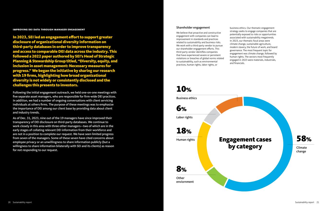 21Sustainability reportSustainability report20 IMPROVING DEI DATA THROUGH MANAGER ENGAGEMENT In 2023, SEI led an engagement effort to support greater disclosure of organizational diversity information on third-party databases in order to improve transparency and access to comparable DEI data across the industry. This followed a 2022 paper authored by SEI’s Head of Strategic Planning & Stewardship Group titled, “Diversity, equity, and inclusion in asset management: Necessary measures for progress.” We began the initiative by sharing our research with 19 firms, highlighting how broad organizational diversity is not widely or consistently disclosed and the challenges this presents to investors. Following the initial engagement outreach, we held one-on-one meetings with five separate asset managers, who are responsible for firm-wide DEI practices. In addition, we had a number of ongoing conversations with client servicing individuals at others firms. The purpose of these meetings was to emphasize the importance of DEI among our client base by providing data about client and industry trends. As of Dec. 31, 2023, nine out of the 19 managers have since improved their transparency of DEI disclosure on third-party databases. We continue to work closely in this area with three other managers—two of which are in the early stages of collating relevant DEI information from their workforce and are not in a position to complete our request. We have seen limited progress from seven of the managers. Some of these seven have cited concerns about employee privacy or an unwillingness to share information publicly (but a willingness to share information bilaterally with SEI and its clients) as reason for not responding to our request. Shareholder engagement We believe that proactive and constructive engagement with companies can lead to improvement in standards and practices related to sustainability and business risks. We work with a third-party vendor to pursue our shareholder engagement efforts. This third-party vendor identifies companies that have experienced severe or persistent violations or breaches of global norms related to sustainability, such as environmental practices, human rights, labor rights, or business ethics. Our thematic engagement strategy seeks to engage companies that are potentially exposed to risks or opportunities associated with sustainability megatrends. In 2023, our thematic focal areas were climate change, sustainable agriculture, modern slavery, the future of work, and board governance. The most frequent topic for engagement was climate change, followed by human rights. The sectors most frequently engaged in 2023 were materials, industrials, and financials. 58% Climate change 8% Other enviornment 18% Human rights 6% Labor rights Engagement cases by category 10% Business ethics