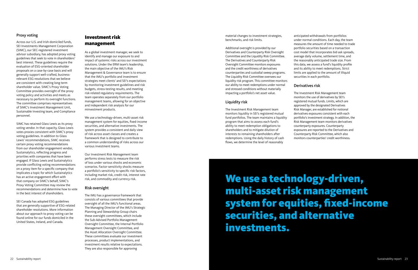 22 Sustainability report Sustainability report 23 Proxy voting Across our U.S. and Irish-domiciled funds, SEI Investments Management Corporation (SIMC), our SEC-registered investment advisor subsidiary, has adopted proxy voting guidelines that seek to vote in shareholders’ best interest. These guidelines require the evaluation of ESG-oriented shareholder proposals on a case-by-case basis and will generally support well-crafted, business- relevant ESG resolutions that we believe are consistent with creating long-term shareholder value. SIMC’s Proxy Voting Committee provides oversight of the proxy voting policy and activities and meets as necessary to perform its oversight functions. The committee comprises representatives of SIMC’s Investment Management Unit, Sustainable Investing team, and Compliance personnel. SIMC has retained Glass Lewis as its proxy voting vendor. In that capacity, Glass Lewis votes proxies consistent with SIMC’s proxy voting guidelines. In addition to Glass Lewis’ recommendations, SIMC receives certain proxy voting recommendations from our shareholder engagement vendor, Sustainalytics, reflecting progress and priorities with companies that have been engaged. If Glass Lewis and Sustainalytics provide conflicting voting recommendations on a proxy item for a specific company that implicates a topic for which Sustainalytics has an active engagement effort with that company on SIMC’s behalf, SIMC’s Proxy Voting Committee may review the recommendations and determine how to vote in the best interest of shareholders. SEI Canada has adopted ESG guidelines that are generally supportive of ESG-related shareholder resolutions. More information about our approach to proxy voting can be found online for our funds domiciled in the United States, Ireland, and Canada. Investment risk management As a global investment manager, we seek to identify and manage our exposure to and impact of systemic risks across our investment solutions. Under the ERM team’s leadership, the main objective of the IMU’s Risk Management & Governance team is to ensure that the IMU’s portfolio and investment strategies meet clients’ and SEI’s expectations by monitoring investment guidelines and risk budgets, stress-testing results, and meeting risk-related regulatory requirements. The team operates separately from our portfolio management teams, allowing for an objective and independent risk analysis for our minvestment products. We use a technology-driven, multi-asset risk management system for equities, fixed-income securities, and alternative investments. The system provides a consistent and daily view of risk across asset classes and creates a framework that is designed to contribute to a common understanding of risks across our various investment teams. Our Investment Risk Management team performs stress tests to measure the risk of loss under various shocks and economic scenarios. Factor-sensitivity shocks measure a portfolio’s sensitivity to specific risk factors, including market risk, credit risk, interest rate risk, and commodity and currency risk. Risk oversight The IMU has a governance framework that consists of various committees that provide oversight of all the IMU’s functional areas. The Managing Director of the IMU’s Strategic Planning and Stewardship Group chairs these oversight committees, which include the Sub-Advised Portfolio Management Oversight Committee, the Internal Portfolio Management Oversight Committee, and the Asset Allocation Oversight Committee. These committees evaluate our investment processes, product implementations, and investment results relative to expectations. They are also responsible for approving material changes to investment strategies, benchmarks, and risk limits. Additional oversight is provided by our Derivatives and Counterparty Risk Oversight Committee and the Liquidity Risk Committee. The Derivatives and Counterparty Risk Oversight Committee monitors exposures and the credit worthiness of derivatives counterparties and custodial sweep programs. The Liquidity Risk Committee oversees our liquidity risk program. This committee monitors our ability to meet redemptions under normal and stressed conditions without materially impacting a portfolio’s net asset value. Liquidity risk The Investment Risk Management team monitors liquidity in SEI’s registered mutual fund portfolios. The team maintains a liquidity program that aims to assess each fund’s ability to meet redemption obligations to shareholders and to mitigate dilution of interests to remaining shareholders after redemptions. Using the daily history of cash flows, we determine the level of reasonably anticipated withdrawals from portfolios under normal conditions. Each day, the team measures the amount of time needed to trade portfolio securities based on a transaction cost model that incorporates bid-ask spreads, average daily volume, settlement time, and the reasonably anticipated trade size. From this data, we assess a fund’s liquidity profile and its ability to meet redemptions. Strict limits are applied to the amount of illiquid securities in each portfolio. Derivatives risk The Investment Risk Management team monitors the use of derivatives by SEI’s registered mutual funds. Limits, which are approved by the designated Derivatives Risk Manager, are established for notional derivatives exposures consistent with each portfolio’s investment strategy. In addition, the Risk Management team monitors derivatives counterparty exposures. Counterparty exposures are reported to the Derivatives and Counterparty Risk Committee, which also monitors counterparties’ credit worthiness. We use a technology-driven, multi-asset risk management system for equities, fixed-income securities, and alternative investments.