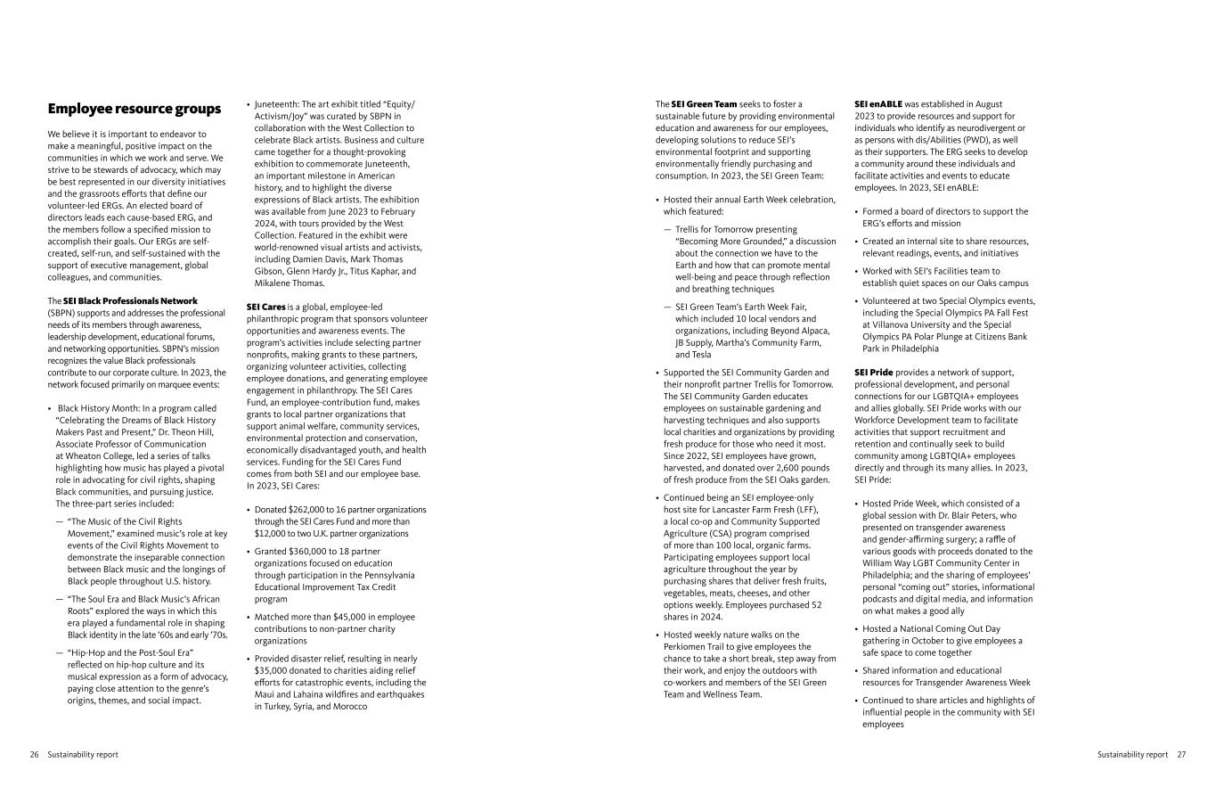 27Sustainability report26 Sustainability report Employee resource groups We believe it is important to endeavor to make a meaningful, positive impact on the communities in which we work and serve. We strive to be stewards of advocacy, which may be best represented in our diversity initiatives and the grassroots efforts that define our volunteer-led ERGs. An elected board of directors leads each cause-based ERG, and the members follow a specified mission to accomplish their goals. Our ERGs are self- created, self-run, and self-sustained with the support of executive management, global colleagues, and communities. The SEI Black Professionals Network (SBPN) supports and addresses the professional needs of its members through awareness, leadership development, educational forums, and networking opportunities. SBPN’s mission recognizes the value Black professionals contribute to our corporate culture. In 2023, the network focused primarily on marquee events: • Black History Month: In a program called “Celebrating the Dreams of Black History Makers Past and Present,” Dr. Theon Hill, Associate Professor of Communication at Wheaton College, led a series of talks highlighting how music has played a pivotal role in advocating for civil rights, shaping Black communities, and pursuing justice. The three-part series included: — “The Music of the Civil Rights Movement,” examined music’s role at key events of the Civil Rights Movement to demonstrate the inseparable connection between Black music and the longings of Black people throughout U.S. history. — “The Soul Era and Black Music’s African Roots” explored the ways in which this era played a fundamental role in shaping Black identity in the late ’60s and early ’70s. — “Hip-Hop and the Post-Soul Era” reflected on hip-hop culture and its musical expression as a form of advocacy, paying close attention to the genre’s origins, themes, and social impact. • Juneteenth: The art exhibit titled “Equity/ Activism/Joy” was curated by SBPN in collaboration with the West Collection to celebrate Black artists. Business and culture came together for a thought-provoking exhibition to commemorate Juneteenth, an important milestone in American history, and to highlight the diverse expressions of Black artists. The exhibition was available from June 2023 to February 2024, with tours provided by the West Collection. Featured in the exhibit were world-renowned visual artists and activists, including Damien Davis, Mark Thomas Gibson, Glenn Hardy Jr., Titus Kaphar, and Mikalene Thomas. SEI Cares is a global, employee-led philanthropic program that sponsors volunteer opportunities and awareness events. The program’s activities include selecting partner nonprofits, making grants to these partners, organizing volunteer activities, collecting employee donations, and generating employee engagement in philanthropy. The SEI Cares Fund, an employee-contribution fund, makes grants to local partner organizations that support animal welfare, community services, environmental protection and conservation, economically disadvantaged youth, and health services. Funding for the SEI Cares Fund comes from both SEI and our employee base. In 2023, SEI Cares: • Donated $262,000 to 16 partner organizations through the SEI Cares Fund and more than $12,000 to two U.K. partner organizations • Granted $360,000 to 18 partner organizations focused on education through participation in the Pennsylvania Educational Improvement Tax Credit program • Matched more than $45,000 in employee contributions to non-partner charity organizations • Provided disaster relief, resulting in nearly $35,000 donated to charities aiding relief efforts for catastrophic events, including the Maui and Lahaina wildfires and earthquakes in Turkey, Syria, and Morocco The SEI Green Team seeks to foster a sustainable future by providing environmental education and awareness for our employees, developing solutions to reduce SEI’s environmental footprint and supporting environmentally friendly purchasing and consumption. In 2023, the SEI Green Team: • Hosted their annual Earth Week celebration, which featured: — Trellis for Tomorrow presenting “Becoming More Grounded,” a discussion about the connection we have to the Earth and how that can promote mental well-being and peace through reflection and breathing techniques — SEI Green Team’s Earth Week Fair, which included 10 local vendors and organizations, including Beyond Alpaca, JB Supply, Martha’s Community Farm, and Tesla • Supported the SEI Community Garden and their nonprofit partner Trellis for Tomorrow. The SEI Community Garden educates employees on sustainable gardening and harvesting techniques and also supports local charities and organizations by providing fresh produce for those who need it most. Since 2022, SEI employees have grown, harvested, and donated over 2,600 pounds of fresh produce from the SEI Oaks garden. • Continued being an SEI employee-only host site for Lancaster Farm Fresh (LFF), a local co-op and Community Supported Agriculture (CSA) program comprised of more than 100 local, organic farms. Participating employees support local agriculture throughout the year by purchasing shares that deliver fresh fruits, vegetables, meats, cheeses, and other options weekly. Employees purchased 52 shares in 2024. • Hosted weekly nature walks on the Perkiomen Trail to give employees the chance to take a short break, step away from their work, and enjoy the outdoors with co-workers and members of the SEI Green Team and Wellness Team. SEI enABLE was established in August 2023 to provide resources and support for individuals who identify as neurodivergent or as persons with dis/Abilities (PWD), as well as their supporters. The ERG seeks to develop a community around these individuals and facilitate activities and events to educate employees. In 2023, SEI enABLE: • Formed a board of directors to suppo