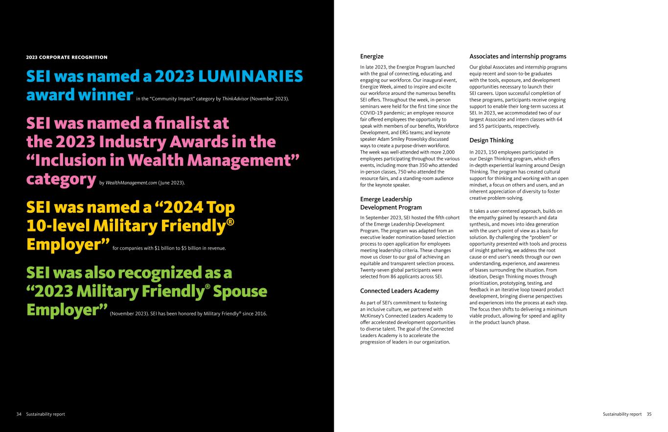 35Sustainability report34 Sustainability report 2023 CORPORATE RECOGNITION SEI was named a 2023 LUMINARIES award winner in the “Community Impact” category by ThinkAdvisor (November 2023). SEI was named a finalist at the 2023 Industry Awards in the “Inclusion in Wealth Management” category by WealthManagement.com (June 2023). SEI was named a “2024 Top 10-level Military Friendly® Employer” for companies with $1 billion to $5 billion in revenue. SEI was also recognized as a “2023 Military Friendly® Spouse Employer” (November 2023). SEI has been honored by Military Friendly® since 2016. Energize In late 2023, the Energize Program launched with the goal of connecting, educating, and engaging our workforce. Our inaugural event, Energize Week, aimed to inspire and excite our workforce around the numerous benefits SEI offers. Throughout the week, in-person seminars were held for the first time since the COVID-19 pandemic; an employee resource fair offered employees the opportunity to speak with members of our benefits, Workforce Development, and ERG teams; and keynote speaker Adam Smiley Poswolsky discussed ways to create a purpose-driven workforce. The week was well-attended with more 2,000 employees participating throughout the various events, including more than 350 who attended in-person classes, 750 who attended the resource fairs, and a standing-room audience for the keynote speaker. Emerge Leadership Development Program In September 2023, SEI hosted the fifth cohort of the Emerge Leadership Development Program. The program was adapted from an executive leader nomination-based selection process to open application for employees meeting leadership criteria. These changes move us closer to our goal of achieving an equitable and transparent selection process. Twenty-seven global participants were selected from 86 applicants across SEI. Connected Leaders Academy As part of SEI’s commitment to fostering an inclusive culture, we partnered with McKinsey’s Connected Leaders Academy to offer accelerated development opportunities to diverse talent. The goal of the Connected Leaders Academy is to accelerate the progression of leaders in our organization. Associates and internship programs Our global Associates and internship programs equip recent and soon-to-be graduates with the tools, exposure, and development opportunities necessary to launch their SEI careers. Upon successful completion of these programs, participants receive ongoing support to enable their long-term success at SEI. In 2023, we accommodated two of our largest Associate and intern classes with 64 and 55 participants, respectively. Design Thinking In 2023, 150 employees participated in our Design Thinking program, which offers in-depth experiential learning around Design Thinking. The program has created cultural support for thinking and working with an open mindset, a focus on others and users, and an inherent appreciation of diversity to foster creative problem-solving. It takes a user-centered approach, builds on the empathy gained by research and data synthesis, and moves into idea generation with the user’s point of view as a basis for solution. By challenging the “problem” or opportunity presented with tools and process of insight gathering, we address the root cause or end user’s needs through our own understanding, experience, and awareness of biases surrounding the situation. From ideation, Design Thinking moves through prioritization, prototyping, testing, and feedback in an iterative loop toward product development, bringing diverse perspectives and experiences into the process at each step. The focus then shifts to delivering a minimum viable product, allowing for speed and agility in the product launch phase.