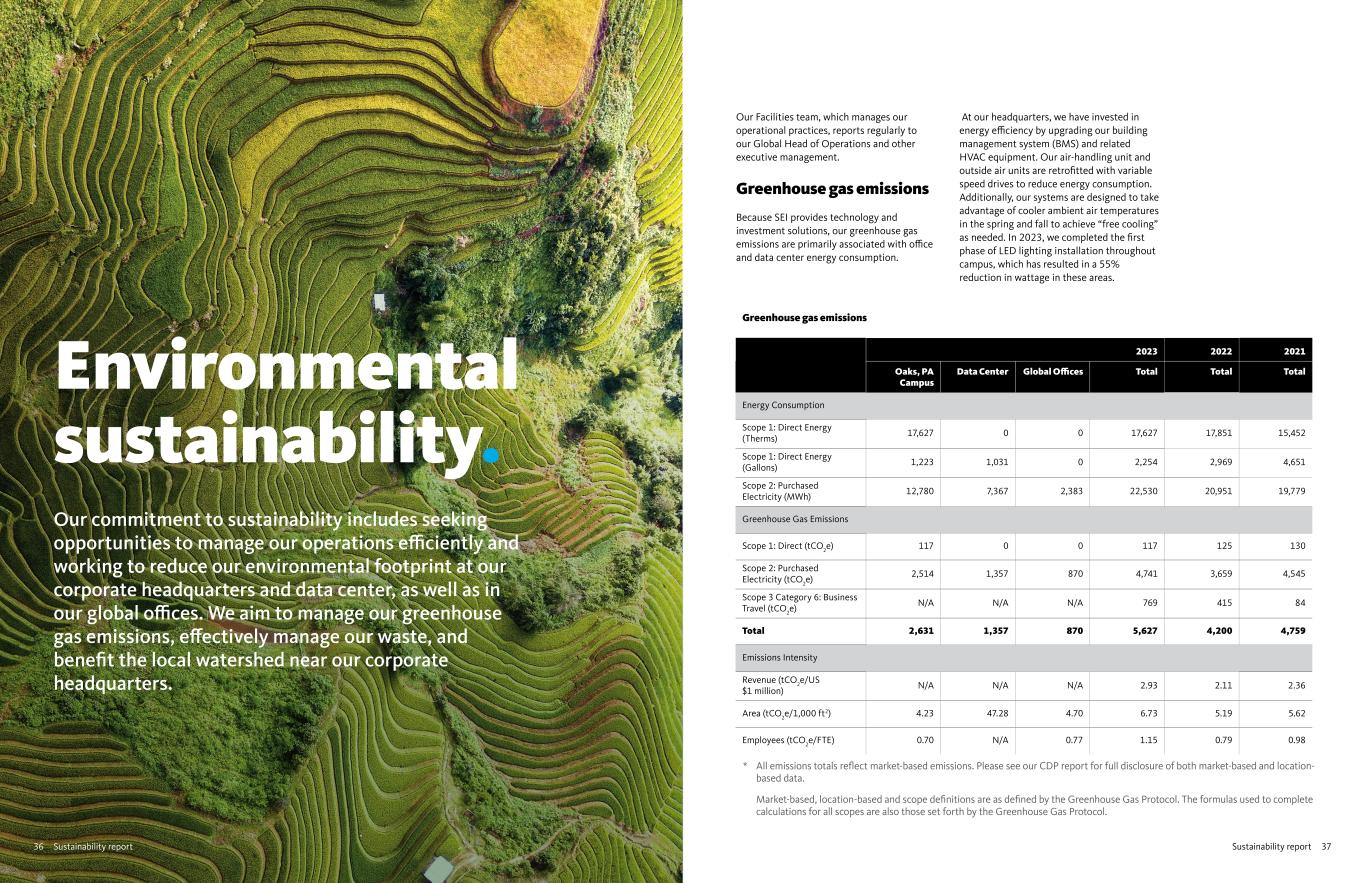 37Sustainability report36 Sustainability report Environmental sustainability. Our commitment to sustainability includes seeking opportunities to manage our operations efficiently and working to reduce our environmental footprint at our corporate headquarters and data center, as well as in our global offices. We aim to manage our greenhouse gas emissions, effectively manage our waste, and benefit the local watershed near our corporate headquarters. Our Facilities team, which manages our operational practices, reports regularly to our Global Head of Operations and other executive management. Greenhouse gas emissions Because SEI provides technology and investment solutions, our greenhouse gas emissions are primarily associated with office and data center energy consumption. At our headquarters, we have invested in energy efficiency by upgrading our building management system (BMS) and related HVAC equipment. Our air-handling unit and outside air units are retrofitted with variable speed drives to reduce energy consumption. Additionally, our systems are designed to take advantage of cooler ambient air temperatures in the spring and fall to achieve “free cooling” as needed. In 2023, we completed the first phase of LED lighting installation throughout campus, which has resulted in a 55% reduction in wattage in these areas. Greenhouse gas emissions 2023 2022 2021 Oaks, PA Campus Data Center Global Offices Total Total Total Energy Consumption Scope 1: Direct Energy (Therms) 17,627 0 0 17,627 17,851 15,452 Scope 1: Direct Energy (Gallons) 1,223 1,031 0 2,254 2,969 4,651 Scope 2: Purchased Electricity (MWh) 12,780 7,367 2,383 22,530 20,951 19,779 Greenhouse Gas Emissions Scope 1: Direct (tCO2e) 117 0 0 117 125 130 Scope 2: Purchased Electricity (tCO2e) 2,514 1,357 870 4,741 3,659 4,545 Scope 3 Category 6: Business Travel (tCO2e) N/A N/A N/A 769 415 84 Total 2,631 1,357 870 5,627 4,200 4,759 Emissions Intensity Revenue (tCO2e/US $1 million) N/A N/A N/A 2.93 2.11 2.36 Area (tCO2e/1,000 ft2) 4.23 47.28 4.70 6.73 5.19 5.62 Employees (tCO2e/FTE) 0.70 N/A 0.77 1.15 0.79 0.98 * All emissions totals reflect market-based emissions. Please see our CDP report for full disclosure of both market-based and location- based data. Market-based, location-based and scope definitions are as defined by the Greenhouse Gas Protocol. The formulas used to complete calculations for all scopes are also those set forth by the Greenhouse Gas Protocol.