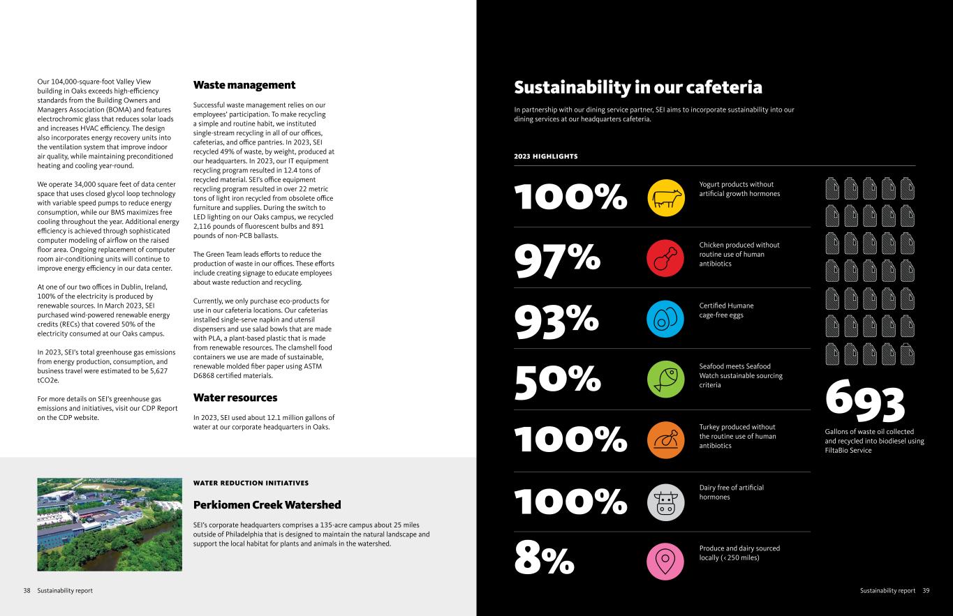 39Sustainability report38 Sustainability report Our 104,000-square-foot Valley View building in Oaks exceeds high-efficiency standards from the Building Owners and Managers Association (BOMA) and features electrochromic glass that reduces solar loads and increases HVAC efficiency. The design also incorporates energy recovery units into the ventilation system that improve indoor air quality, while maintaining preconditioned heating and cooling year-round. We operate 34,000 square feet of data center space that uses closed glycol loop technology with variable speed pumps to reduce energy consumption, while our BMS maximizes free cooling throughout the year. Additional energy efficiency is achieved through sophisticated computer modeling of airflow on the raised floor area. Ongoing replacement of computer room air-conditioning units will continue to improve energy efficiency in our data center. At one of our two offices in Dublin, Ireland, 100% of the electricity is produced by renewable sources. In March 2023, SEI purchased wind-powered renewable energy credits (RECs) that covered 50% of the electricity consumed at our Oaks campus. In 2023, SEI’s total greenhouse gas emissions from energy production, consumption, and business travel were estimated to be 5,627 tCO2e. For more details on SEI’s greenhouse gas emissions and initiatives, visit our CDP Report on the CDP website. Waste management Successful waste management relies on our employees’ participation. To make recycling a simple and routine habit, we instituted single-stream recycling in all of our offices, cafeterias, and office pantries. In 2023, SEI recycled 49% of waste, by weight, produced at our headquarters. In 2023, our IT equipment recycling program resulted in 12.4 tons of recycled material. SEI’s office equipment recycling program resulted in over 22 metric tons of light iron recycled from obsolete office furniture and supplies. During the switch to LED lighting on our Oaks campus, we recycled 2,116 pounds of fluorescent bulbs and 891 pounds of non-PCB ballasts. The Green Team leads efforts to reduce the production of waste in our offices. These efforts include creating signage to educate employees about waste reduction and recycling. Currently, we only purchase eco-products for use in our cafeteria locations. Our cafeterias installed single-serve napkin and utensil dispensers and use salad bowls that are made with PLA, a plant-based plastic that is made from renewable resources. The clamshell food containers we use are made of sustainable, renewable molded fiber paper using ASTM D6868 certified materials. Water resources In 2023, SEI used about 12.1 million gallons of water at our corporate headquarters in Oaks. Sustainability in our cafeteria In partnership with our dining service partner, SEI aims to incorporate sustainability into our dining services at our headquarters cafeteria. 2023 HIGHLIGHTS Certified Humane cage-free eggs Seafood meets Seafood Watch sustainable sourcing criteria Turkey produced without the routine use of human antibiotics Dairy free of artificial hormones Chicken produced without routine use of human antibiotics 100% 97% 93% 50% 100% 100% Yogurt products without artificial growth hormones Produce and dairy sourced locally (<250 miles)8% WATER REDUCTION INITIATIVES Perkiomen Creek Watershed SEI’s corporate headquarters comprises a 135-acre campus about 25 miles outside of Philadelphia that is designed to maintain the natural landscape and support the local habitat for plants and animals in the watershed. 693 Gallons of waste oil collected and recycled into biodiesel using FiltaBio Service