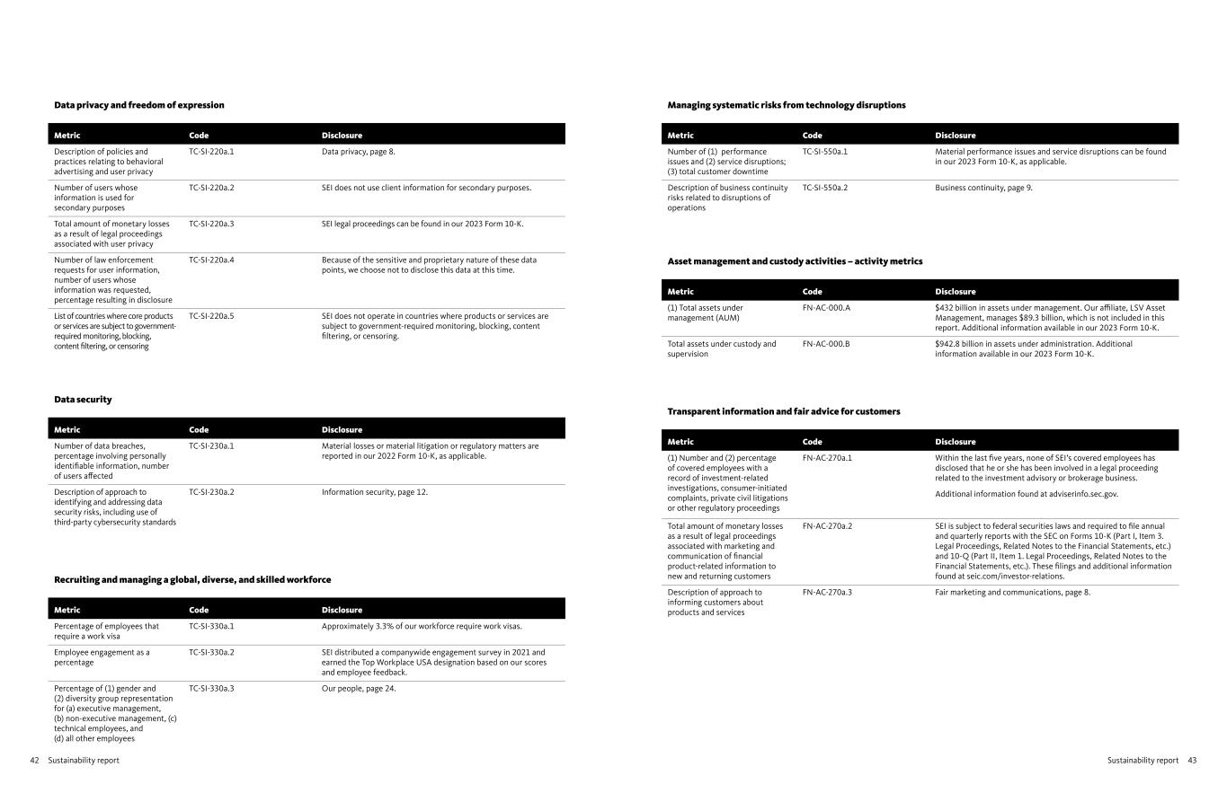 43Sustainability report42 Sustainability report Data privacy and freedom of expression Metric Code Disclosure Description of policies and practices relating to behavioral advertising and user privacy TC-SI-220a.1 Data privacy, page 8. Number of users whose information is used for secondary purposes TC-SI-220a.2 SEI does not use client information for secondary purposes. Total amount of monetary losses as a result of legal proceedings associated with user privacy TC-SI-220a.3 SEI legal proceedings can be found in our 2023 Form 10-K. Number of law enforcement requests for user information, number of users whose information was requested, percentage resulting in disclosure TC-SI-220a.4 Because of the sensitive and proprietary nature of these data points, we choose not to disclose this data at this time. List of countries where core products or services are subject to government- required monitoring, blocking, content filtering, or censoring TC-SI-220a.5 SEI does not operate in countries where products or services are subject to government-required monitoring, blocking, content filtering, or censoring. Data security Metric Code Disclosure Number of data breaches, percentage involving personally identifiable information, number of users affected TC-SI-230a.1 Material losses or material litigation or regulatory matters are reported in our 2022 Form 10-K, as applicable. Description of approach to identifying and addressing data security risks, including use of third-party cybersecurity standards TC-SI-230a.2 Information security, page 12. Recruiting and managing a global, diverse, and skilled workforce Metric Code Disclosure Percentage of employees that require a work visa TC-SI-330a.1 Approximately 3.3% of our workforce require work visas. Employee engagement as a percentage TC-SI-330a.2 SEI distributed a companywide engagement survey in 2021 and earned the Top Workplace USA designation based on our scores and employee feedback. Percentage of (1) gender and (2) diversity group representation for (a) executive management, (b) non-executive management, (c) technical employees, and (d) all other employees TC-SI-330a.3 Our people, page 24. Managing systematic risks from technology disruptions Metric Code Disclosure Number of (1) performance issues and (2) service disruptions; (3) total customer downtime TC-SI-550a.1 Material performance issues and service disruptions can be found in our 2023 Form 10-K, as applicable. Description of business continuity risks related to disruptions of operations TC-SI-550a.2 Business continuity, page 9. Asset management and custody activities – activity metrics Metric Code Disclosure (1) Total assets under management (AUM) FN-AC-000.A $432 billion in assets under management. Our affiliate, LSV Asset Management, manages $89.3 billion, which is not included in this report. Additional information available in our 2023 Form 10-K. Total assets under custody and supervision FN-AC-000.B $942.8 billion in assets under administration. Additional information available in our 2023 Form 10-K. Transparent information and fair advice for customers Metric Code Disclosure (1) Number and (2) percentage of covered employees with a record of investment-related investigations, consumer-initiated complaints, private civil litigations or other regulatory proceedings FN-AC-270a.1 Within the last five years, none of SEI’s covered employees has disclosed that he or she has been involved in a legal proceeding related to the investment advisory or brokerage business. Additional information found at adviserinfo.sec.gov. Total amount of monetary losses as a result of legal proceedings associated with marketing and communication of financial product-related information to new and returning customers FN-AC-270a.2 SEI is subject to federal securities laws and required to file annual and quarterly reports with the SEC on Forms 10-K (Part I, Item 3. Legal Proceedings, Related Notes to the Financial Statements, etc.) and 10-Q (Part II, Item 1. Legal Proceedings, Related Notes to the Financial Statements, etc.). These filings and additional information found at seic.com/investor-relations. Description of approach to informing customers about products and services FN-AC-270a.3 Fair marketing and communications, page 8.