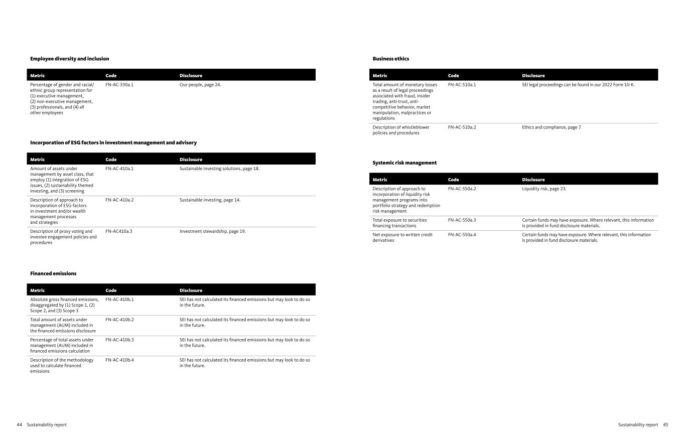Sustainability report44 Sustainability report 45 Employee diversity and inclusion Metric Code Disclosure Percentage of gender and racial/ ethnic group representation for (1) executive management, (2) non-executive management, (3) professionals, and (4) all other employees FN-AC-330a.1 Our people, page 24. Incorporation of ESG factors in investment management and advisory Metric Code Disclosure Amount of assets under management by asset class, that employ (1) integration of ESG issues, (2) sustainability themed investing, and (3) screening FN-AC-410a.1 Sustainable investing solutions, page 18. Description of approach to incorporation of ESG factors in investment and/or wealth management processes and strategies FN-AC-410a.2 Sustainable investing, page 14. Description of proxy voting and investee engagement policies and procedures FN-AC410a.3 Investment stewardship, page 19. Financed emissions Metric Code Disclosure Absolute gross financed emissions, disaggregated by (1) Scope 1, (2) Scope 2, and (3) Scope 3 FN-AC-410b.1 SEI has not calculated its financed emissions but may look to do so in the future. Total amount of assets under management (AUM) included in the financed emissions disclosure FN-AC-410b.2 SEI has not calculated its financed emissions but may look to do so in the future. Percentage of total assets under management (AUM) included in financed emissions calculation FN-AC-410b.3 SEI has not calculated its financed emissions but may look to do so in the future. Description of the methodology used to calculate financed emissions FN-AC-410b.4 SEI has not calculated its financed emissions but may look to do so in the future. Business ethics Metric Code Disclosure Total amount of monetary losses as a result of legal proceedings associated with fraud, insider trading, anti-trust, anti- competitive behavior, market manipulation, malpractices or regulations FN-AC-510a.1 SEI legal proceedings can be found in our 2022 Form 10-K. Description of whistleblower policies and procedures FN-AC-510a.2 Ethics and compliance, page 7. Systemic risk management Metric Code Disclosure Description of approach to incorporation of liquidity risk management programs into portfolio strategy and redemption risk management FN-AC-550a.2 Liquidity risk, page 23. Total exposure to securities financing transactions FN-AC-550a.3 Certain funds may have exposure. Where relevant, this information is provided in fund disclosure materials. Net exposure to written credit derivatives FN-AC-550a.4 Certain funds may have exposure. Where relevant, this information is provided in fund disclosure materials.