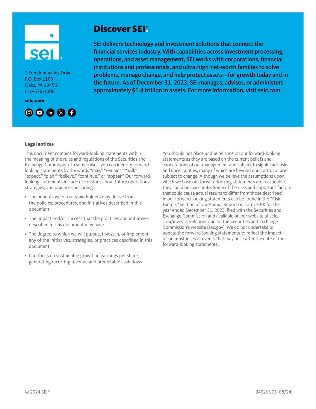 Discover SEI.® SEI delivers technology and investment solutions that connect the financial services industry. With capabilities across investment processing, operations, and asset management, SEI works with corporations, financial institutions and professionals, and ultra-high-net-worth families to solve problems, manage change, and help protect assets—for growth today and in the future. As of December 31, 2023, SEI manages, advises, or administers approximately $1.4 trillion in assets. For more information, visit seic.com. Legal notices This document contains forward-looking statements within the meaning of the rules and regulations of the Securities and Exchange Commission. In some cases, you can identify forward- looking statements by the words “may,” “remains,” “will,” “expect,” “plan,” “believe,” “continue,” or “appear.” Our forward- looking statements include discussions about future operations, strategies, and practices, including: • The benefits we or our stakeholders may derive from the policies, procedures, and initiatives described in this document. • The impact and/or success that the practices and initiatives described in this document may have. • The degree to which we will pursue, invest in, or implement any of the initiatives, strategies, or practices described in this document. • Our focus on sustainable growth in earnings per share, generating recurring revenue and predictable cash flows. You should not place undue reliance on our forward-looking statements as they are based on the current beliefs and expectations of our management and subject to significant risks and uncertainties, many of which are beyond our control or are subject to change. Although we believe the assumptions upon which we base our forward-looking statements are reasonable, they could be inaccurate. Some of the risks and important factors that could cause actual results to differ from those described in our forward-looking statements can be found in the “Risk Factors” section of our Annual Report on Form 10-K for the year ended December 31, 2023, filed with the Securities and Exchange Commission and available on our website at seic. com/investor-relations and on the Securities and Exchange Commission’s website (sec.gov). We do not undertake to update the forward-looking statements to reflect the impact of circumstances or events that may arise after the date of the forward-looking statements. © 2024 SEI® 240265.03 08/24 1 Freedom Valley Drive P.O. Box 1100 Oaks, PA 19456 610-676-1000 seic.com