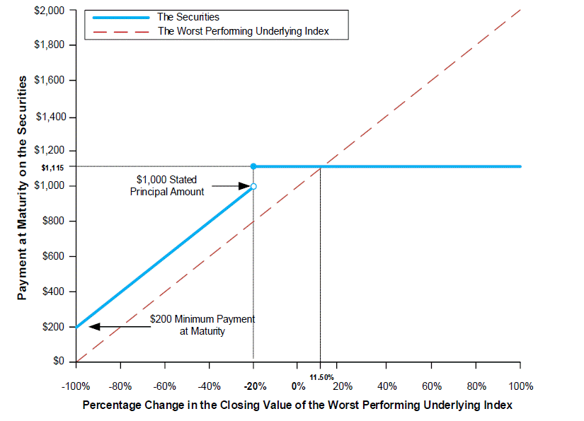 The payment at maturity will be based solely on the performance of the worst performing underlying index, which could be either underlying index. The graph and table below illustrate the payment at maturity depending on the performance of the worst performing underlying index.