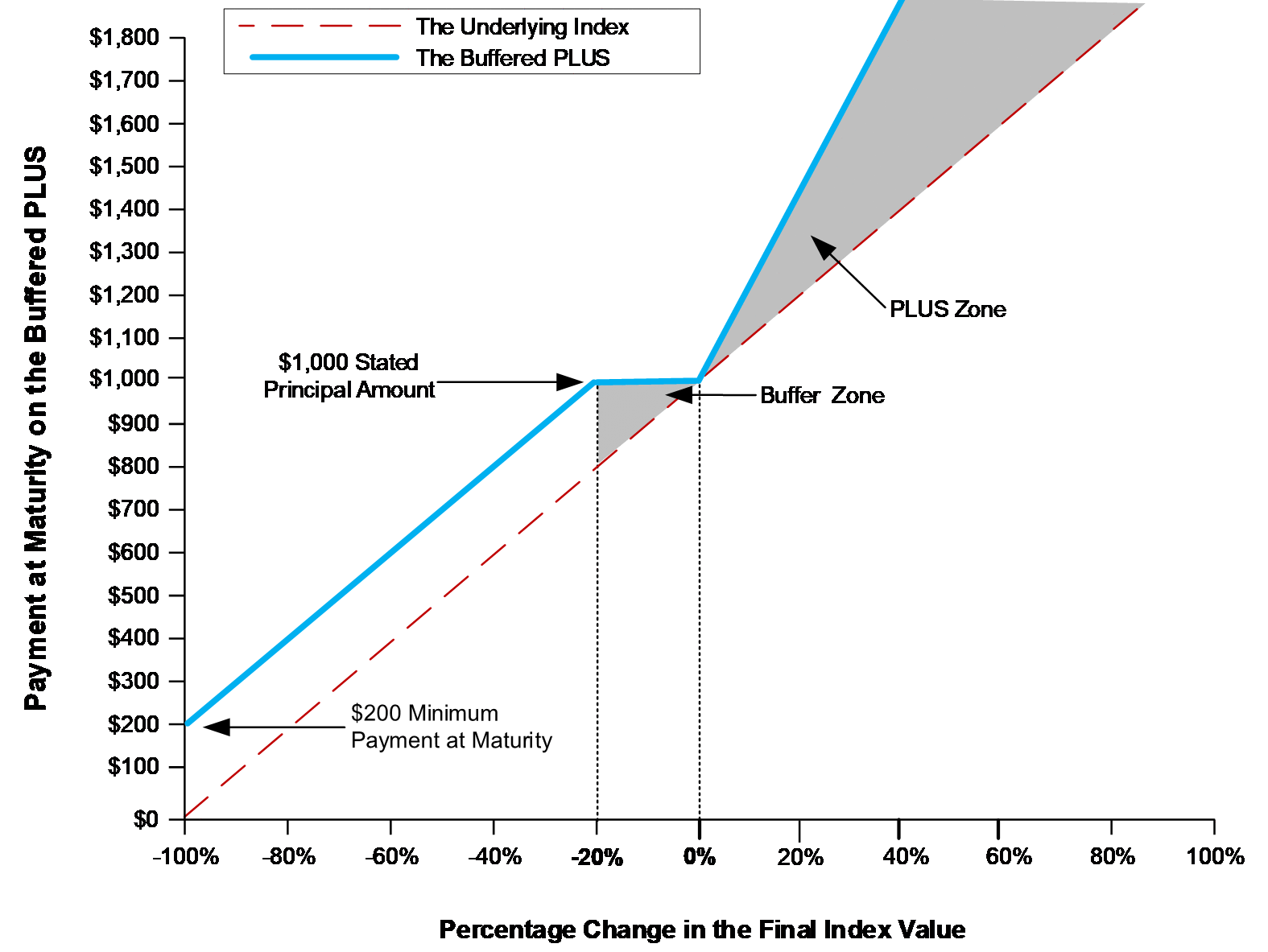 If the final index value is greater than the initial index value: $1,000 + leveraged upside payment If the final index value is less than or equal to the initial index value but has decreased from the initial index value by an amount less than or equal to the buffer amount of 20%: $1,000 If the final index value is less than the initial index value and has decreased from the initial index value by an amount greater than the buffer amount of 20%: ($1,000 × the index performance factor) + $200 Under these circumstances, the payment at maturity will be less than the stated principal amount of $1,000. However, under no circumstances will the Buffered PLUS pay less than $200 per Buffered PLUS at maturity. |
