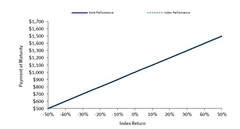 The following table and graph illustrate the hypothetical total return and payment at maturity on the notes linked to a hypothetical Index. The “total return” as used in this pricing supplement is the number, expressed as a percentage, that results from comparing the payment at maturity per $1,000 principal amount note to $1,000. The hypothetical total returns and payments set forth below assume the following: