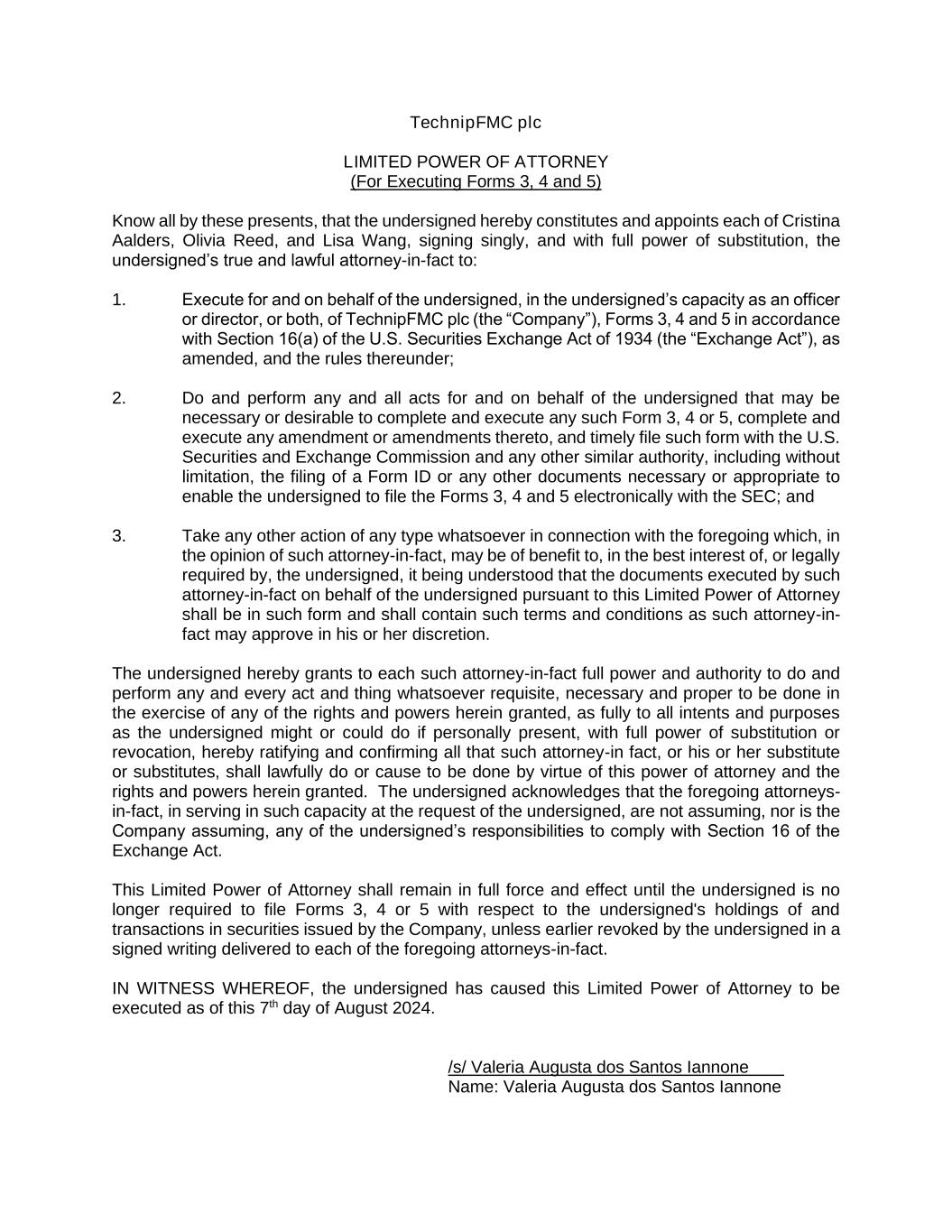 TechnipFMC plc LIMITED POWER OF ATTORNEY (For Executing Forms 3, 4 and 5) Know all by these presents, that the undersigned hereby constitutes and appoints each of Cristina Aalders, Olivia Reed, and Lisa Wang, signing singly, and with full power of substitution, the undersigned’s true and lawful attorney-in-fact to: 1. Execute for and on behalf of the undersigned, in the undersigned’s capacity as an officer or director, or both, of TechnipFMC plc (the “Company”), Forms 3, 4 and 5 in accordance with Section 16(a) of the U.S. Securities Exchange Act of 1934 (the “Exchange Act”), as amended, and the rules thereunder; 2. Do and perform any and all acts for and on behalf of the undersigned that may be necessary or desirable to complete and execute any such Form 3, 4 or 5, complete and execute any amendment or amendments thereto, and timely file such form with the U.S. Securities and Exchange Commission and any other similar authority, including without limitation, the filing of a Form ID or any other documents necessary or appropriate to enable the undersigned to file the Forms 3, 4 and 5 electronically with the SEC; and 3. Take any other action of any type whatsoever in connection with the foregoing which, in the opinion of such attorney-in-fact, may be of benefit to, in the best interest of, or legally required by, the undersigned, it being understood that the documents executed by such attorney-in-fact on behalf of the undersigned pursuant to this Limited Power of Attorney shall be in such form and shall contain such terms and conditions as such attorney-in- fact may approve in his or her discretion. The undersigned hereby grants to each such attorney-in-fact full power and authority to do and perform any and every act and thing whatsoever requisite, necessary and proper to be done in the exercise of any of the rights and powers herein granted, as fully to all intents and purposes as the undersigned might or could do if personally present, with full power of substitution or revocation, hereby ratifying and confirming all that such attorney-in fact, or his or her substitute or substitutes, shall lawfully do or cause to be done by virtue of this power of attorney and the rights and powers herein granted. The undersigned acknowledges that the foregoing attorneys- in-fact, in serving in such capacity at the request of the undersigned, are not assuming, nor is the Company assuming, any of the undersigned’s responsibilities to comply with Section 16 of the Exchange Act. This Limited Power of Attorney shall remain in full force and effect until the undersigned is no longer required to file Forms 3, 4 or 5 with respect to the undersigned's holdings of and transactions in securities issued by the Company, unless earlier revoked by the undersigned in a signed writing delivered to each of the foregoing attorneys-in-fact. IN WITNESS WHEREOF, the undersigned has caused this Limited Power of Attorney to be executed as of this 7th day of August 2024. /s/ Valeria Augusta dos Santos Iannone Name: Valeria Augusta dos Santos Iannone