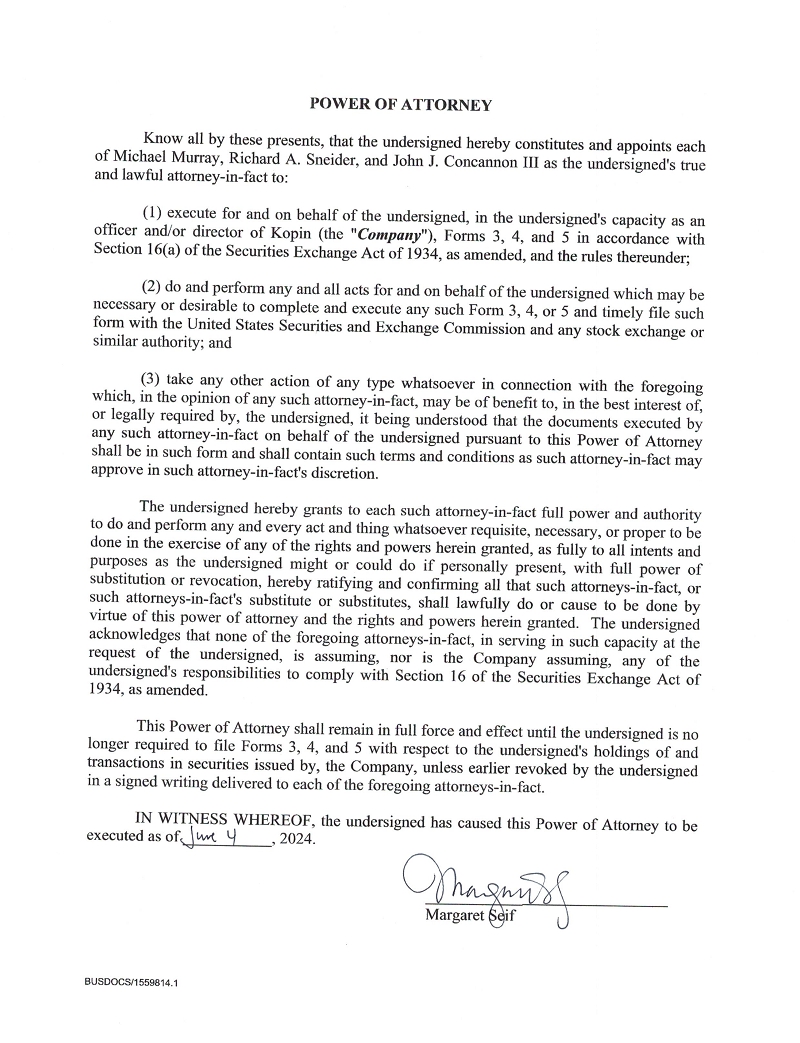 X0206 3 2024-06-06 0 0000771266 KOPIN CORP KOPN 0001206591 SEIF MARGARET K 99 FLORENCE STREET NEWTON MA 02467 1 0 0 0 Common stock 0 D Ex. 24 - Power of Attorney /s/ John J. Concannon, as Attorney-in-fact 2024-09-03