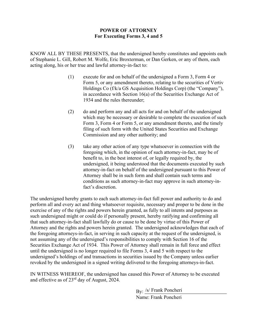 POWER OF ATTORNEY For Executing Forms 3, 4 and 5 KNOW ALL BY THESE PRESENTS, that the undersigned hereby constitutes and appoints each of Stephanie L. Gill, Robert M. Wolfe, Eric Broxterman, or Dan Gerken, or any of them, each acting along, his or her true and lawful attorney-in-fact to: (1) execute for and on behalf of the undersigned a Form 3, Form 4 or Form 5, or any amendment thereto, relating to the securities of Vertiv Holdings Co (f/k/a GS Acquisition Holdings Corp) (the “Company”), in accordance with Section 16(a) of the Securities Exchange Act of 1934 and the rules thereunder; (2) do and perform any and all acts for and on behalf of the undersigned which may be necessary or desirable to complete the execution of such Form 3, Form 4 or Form 5, or any amendment thereto, and the timely filing of such form with the United States Securities and Exchange Commission and any other authority; and (3) take any other action of any type whatsoever in connection with the foregoing which, in the opinion of such attorney-in-fact, may be of benefit to, in the best interest of, or legally required by, the undersigned, it being understood that the documents executed by such attorney-in-fact on behalf of the undersigned pursuant to this Power of Attorney shall be in such form and shall contain such terms and conditions as such attorney-in-fact may approve in such attorney-in- fact’s discretion. The undersigned hereby grants to each such attorney-in-fact full power and authority to do and perform all and every act and thing whatsoever requisite, necessary and proper to be done in the exercise of any of the rights and powers herein granted, as fully to all intents and purposes as such undersigned might or could do if personally present, hereby ratifying and confirming all that such attorney-in-fact shall lawfully do or cause to be done by virtue of this Power of Attorney and the rights and powers herein granted. The undersigned acknowledges that each of the foregoing attorneys-in-fact, in serving in such capacity at the request of the undersigned, is not assuming any of the undersigned’s responsibilities to comply with Section 16 of the Securities Exchange Act of 1934. This Power of Attorney shall remain in full force and effect until the undersigned is no longer required to file Forms 3, 4 and 5 with respect to the undersigned’s holdings of and transactions in securities issued by the Company unless earlier revoked by the undersigned in a signed writing delivered to the foregoing attorneys-in-fact. IN WITNESS WHEREOF, the undersigned has caused this Power of Attorney to be executed and effective as of 23rd day of August, 2024. By: Name: Frank Poncheri /s/ Frank Poncheri