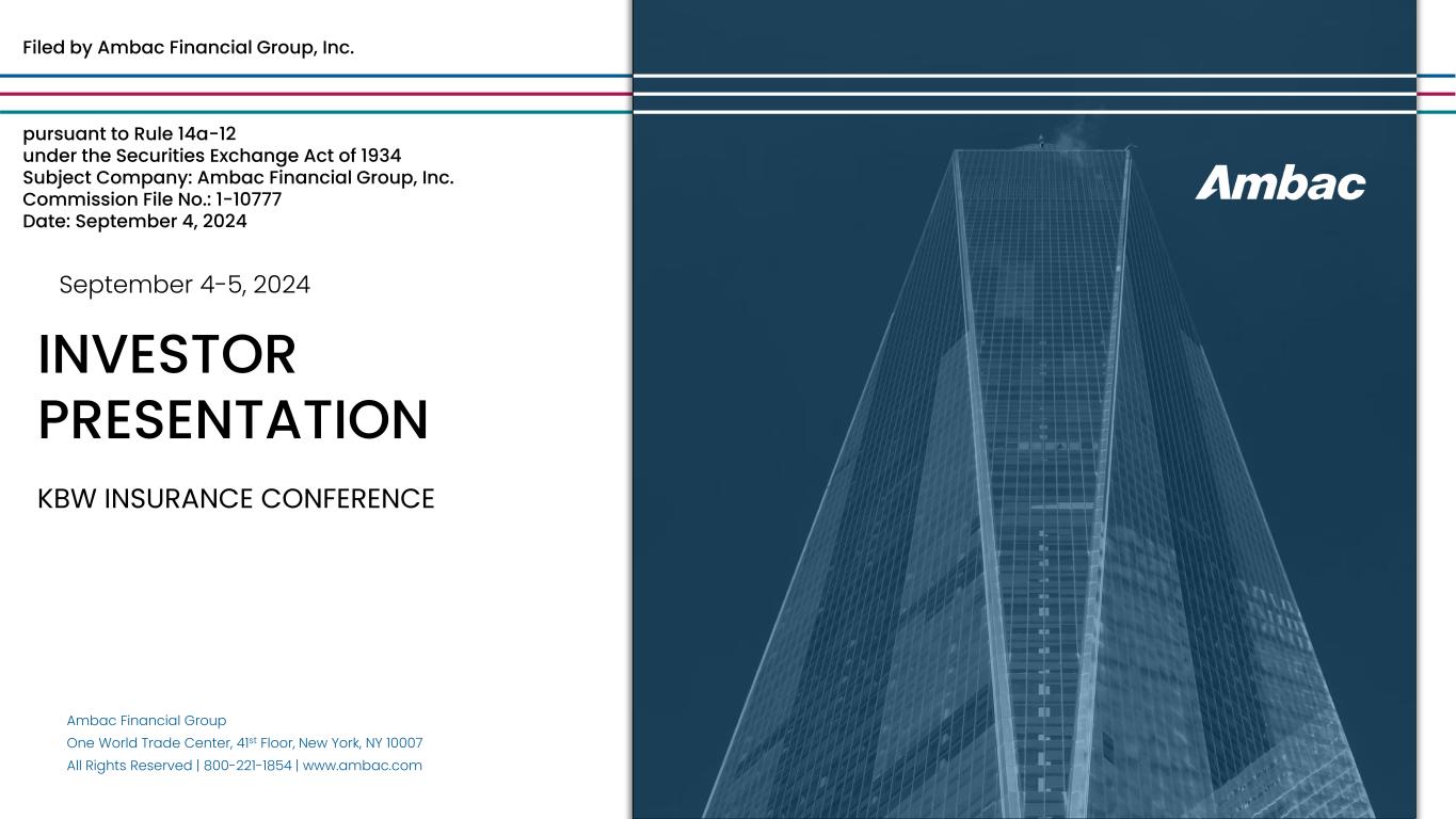 Ambac Financial Group One World Trade Center, 41st Floor, New York, NY 10007 All Rights Reserved | 800-221-1854 | www.ambac.com September 4-5, 2024 INVESTOR PRESENTATION KBW INSURANCE CONFERENCE Filed by Ambac Financial Group, Inc. pursuant to Rule 14a-12 under the Securities Exchange Act of 1934 Subject Company: Ambac Financial Group, Inc. Commission File No.: 1-10777 Date: September 4, 2024