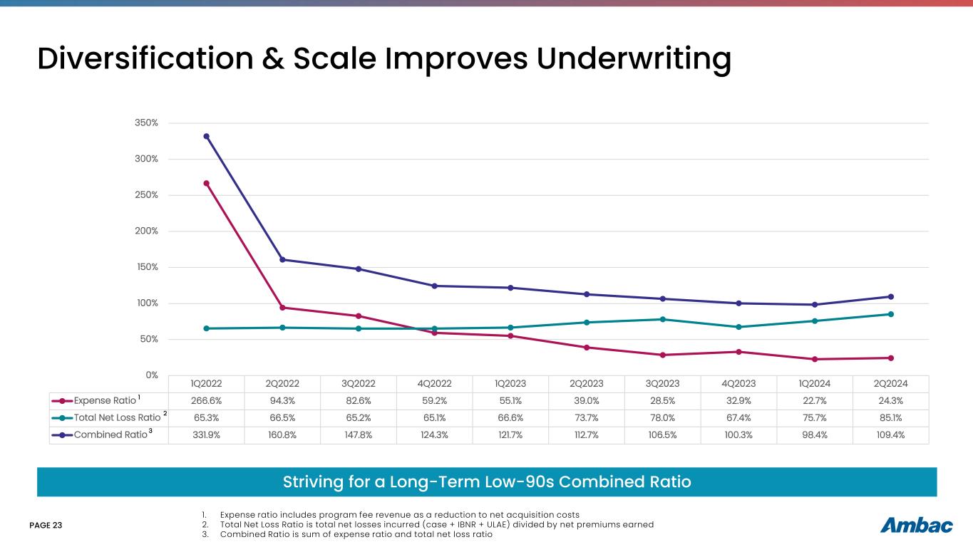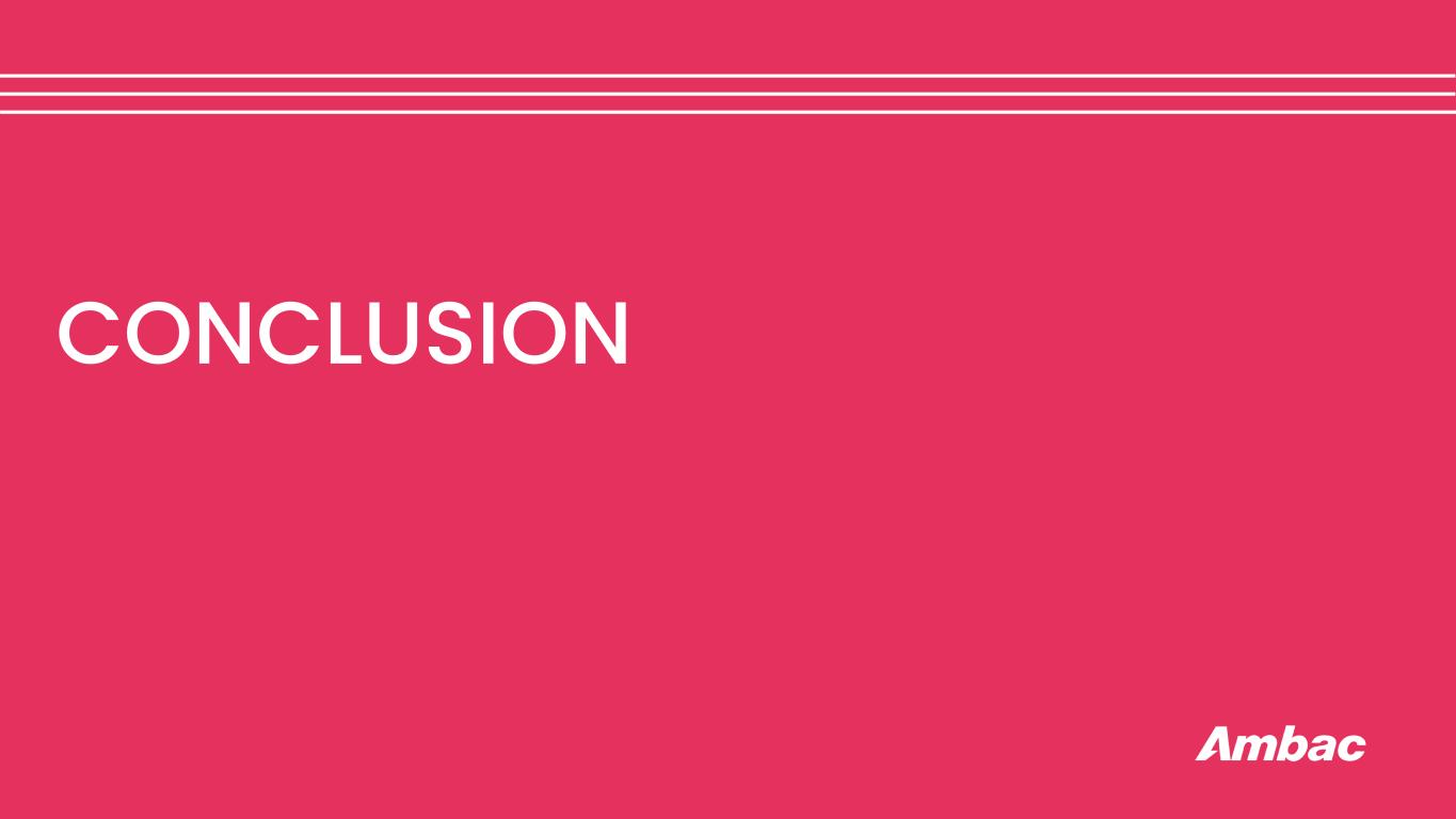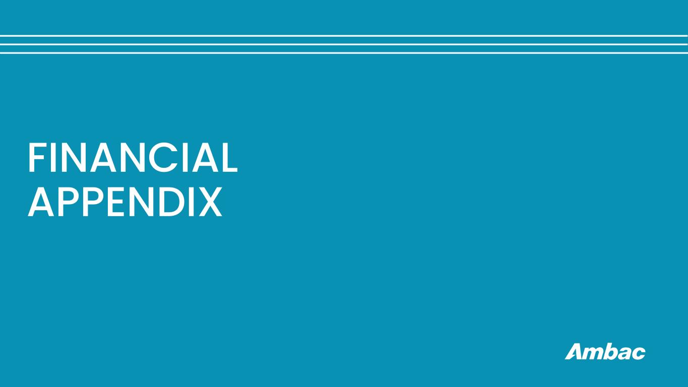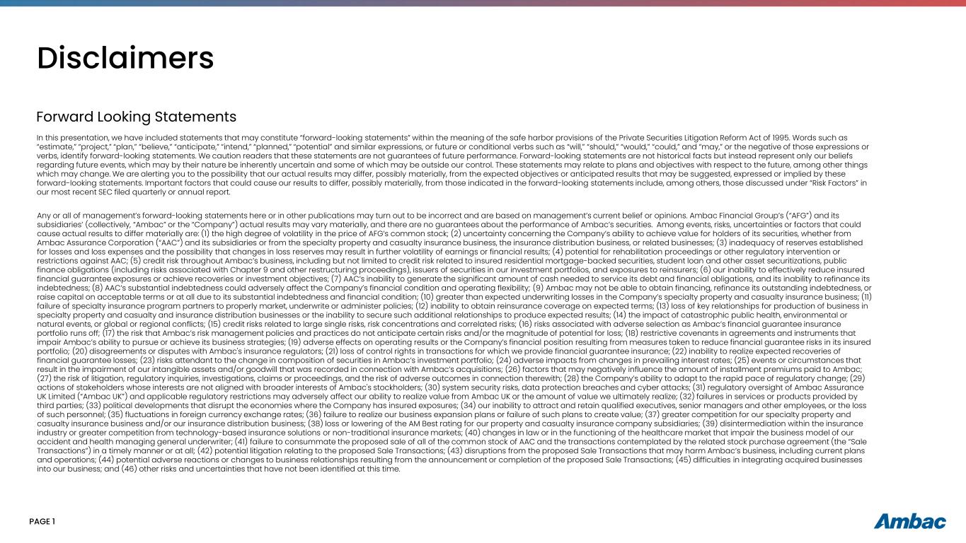 PAGE 1 Forward Looking Statements Disclaimers In this presentation, we have included statements that may constitute “forward-looking statements” within the meaning of the safe harbor provisions of the Private Securities Litigation Reform Act of 1995. Words such as “estimate,” “project,” “plan,” “believe,” “anticipate,” “intend,” “planned,” “potential” and similar expressions, or future or conditional verbs such as “will,” “should,” “would,” “could,” and “may,” or the negative of those expressions or verbs, identify forward-looking statements. We caution readers that these statements are not guarantees of future performance. Forward-looking statements are not historical facts but instead represent only our beliefs regarding future events, which may by their nature be inherently uncertain and some of which may be outside our control. These statements may relate to plans and objectives with respect to the future, among other things which may change. We are alerting you to the possibility that our actual results may differ, possibly materially, from the expected objectives or anticipated results that may be suggested, expressed or implied by these forward-looking statements. Important factors that could cause our results to differ, possibly materially, from those indicated in the forward-looking statements include, among others, those discussed under “Risk Factors” in our most recent SEC filed quarterly or annual report. Any or all of management’s forward-looking statements here or in other publications may turn out to be incorrect and are based on management’s current belief or opinions. Ambac Financial Group’s (“AFG”) and its subsidiaries’ (collectively, “Ambac” or the “Company”) actual results may vary materially, and there are no guarantees about the performance of Ambac’s securities. Among events, risks, uncertainties or factors that could cause actual results to differ materially are: (1) the high degree of volatility in the price of AFG’s common stock; (2) uncertainty concerning the Company’s ability to achieve value for holders of its securities, whether from Ambac Assurance Corporation (“AAC”) and its subsidiaries or from the specialty property and casualty insurance business, the insurance distribution business, or related businesses; (3) inadequacy of reserves established for losses and loss expenses and the possibility that changes in loss reserves may result in further volatility of earnings or financial results; (4) potential for rehabilitation proceedings or other regulatory intervention or restrictions against AAC; (5) credit risk throughout Ambac’s business, including but not limited to credit risk related to insured residential mortgage-backed securities, student loan and other asset securitizations, public finance obligations (including risks associated with Chapter 9 and other restructuring proceedings), issuers of securities in our investment portfolios, and exposures to reinsurers; (6) our inability to effectively reduce insured financial guarantee exposures or achieve recoveries or investment objectives; (7) AAC’s inability to generate the significant amount of cash needed to service its debt and financial obligations, and its inability to refinance its indebtedness; (8) AAC’s substantial indebtedness could adversely affect the Company’s financial condition and operating flexibility; (9) Ambac may not be able to obtain financing, refinance its outstanding indebtedness, or raise capital on acceptable terms or at all due to its substantial indebtedness and financial condition; (10) greater than expected underwriting losses in the Company’s specialty property and casualty insurance business; (11) failure of specialty insurance program partners to properly market, underwrite or administer policies; (12) inability to obtain reinsurance coverage on expected terms; (13) loss of key relationships for production of business in specialty property and casualty and insurance distribution businesses or the inability to secure such additional relationships to produce expected results; (14) the impact of catastrophic public health, environmental or natural events, or global or regional conflicts; (15) credit risks related to large single risks, risk concentrations and correlated risks; (16) risks associated with adverse selection as Ambac’s financial guarantee insurance portfolio runs off; (17) the risk that Ambac’s risk management policies and practices do not anticipate certain risks and/or the magnitude of potential for loss; (18) restrictive covenants in agreements and instruments that impair Ambac’s ability to pursue or achieve its business strategies; (19) adverse effects on operating results or the Company’s financial position resulting from measures taken to reduce financial guarantee risks in its insured portfolio; (20) disagreements or disputes with Ambac's insurance regulators; (21) loss of control rights in transactions for which we provide financial guarantee insurance; (22) inability to realize expected recoveries of financial guarantee losses; (23) risks attendant to the change in composition of securities in Ambac’s investment portfolio; (24) adverse impacts from changes in prevailing interest rates; (25) events or circumstances that result in the impairment of our intangible assets and/or goodwill that was recorded in connection with Ambac’s acquisitions; (26) factors that may negatively influence the amount of installment premiums paid to Ambac; (27) the risk of litigation, regulatory inquiries, investigations, claims or proceedings, and the risk of adverse outcomes in connection therewith; (28) the Company’s ability to adapt to the rapid pace of regulatory change; (29) actions of stakeholders whose interests are not aligned with broader interests of Ambac's stockholders; (30) system security risks, data protection breaches and cyber attacks; (31) regula