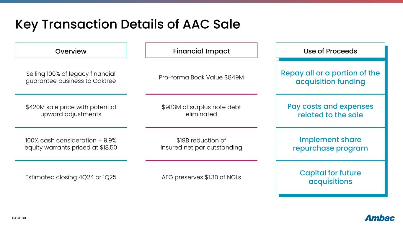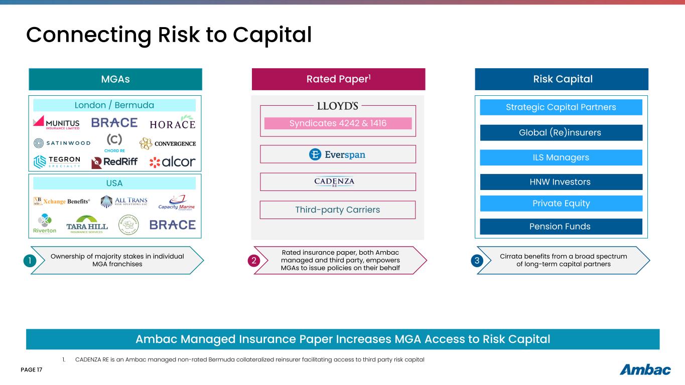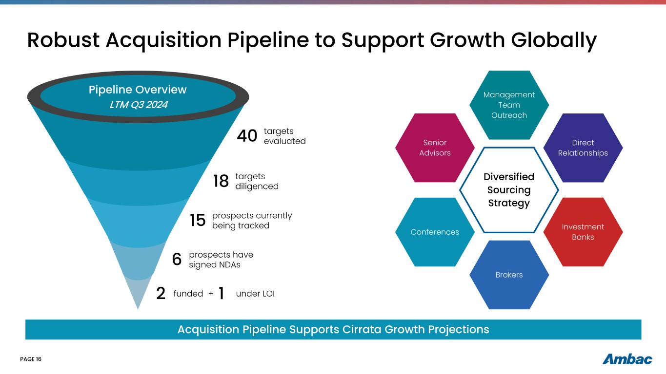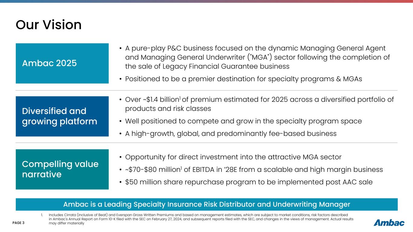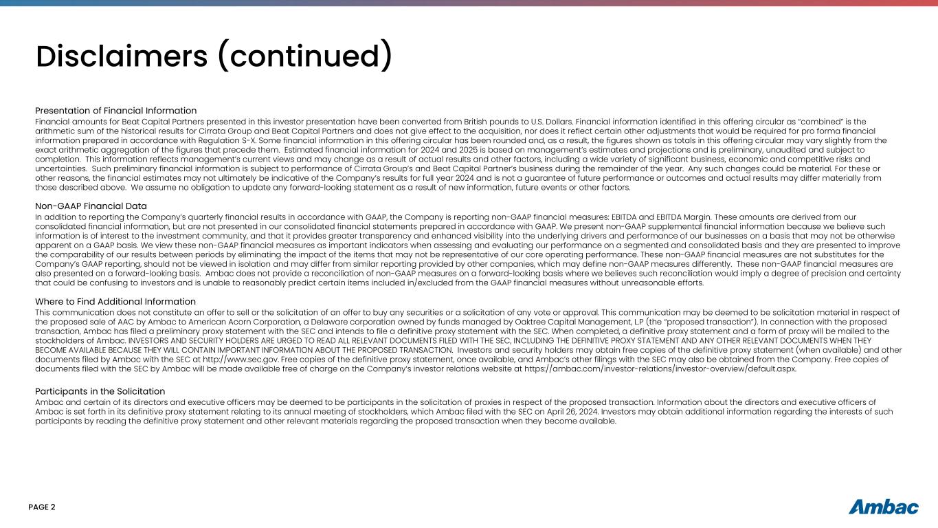 PAGE 2 Presentation of Financial Information Financial amounts for Beat Capital Partners presented in this investor presentation have been converted from British pounds to U.S. Dollars. Financial information identified in this offering circular as “combined” is the arithmetic sum of the historical results for Cirrata Group and Beat Capital Partners and does not give effect to the acquisition, nor does it reflect certain other adjustments that would be required for pro forma financial information prepared in accordance with Regulation S-X. Some financial information in this offering circular has been rounded and, as a result, the figures shown as totals in this offering circular may vary slightly from the exact arithmetic aggregation of the figures that precede them. Estimated financial information for 2024 and 2025 is based on management’s estimates and projections and is preliminary, unaudited and subject to completion. This information reflects management’s current views and may change as a result of actual results and other factors, including a wide variety of significant business, economic and competitive risks and uncertainties. Such preliminary financial information is subject to performance of Cirrata Group’s and Beat Capital Partner’s business during the remainder of the year. Any such changes could be material. For these or other reasons, the financial estimates may not ultimately be indicative of the Company’s results for full year 2024 and is not a guarantee of future performance or outcomes and actual results may differ materially from those described above. We assume no obligation to update any forward-looking statement as a result of new information, future events or other factors. Non-GAAP Financial Data In addition to reporting the Company’s quarterly financial results in accordance with GAAP, the Company is reporting non-GAAP financial measures: EBITDA and EBITDA Margin. These amounts are derived from our consolidated financial information, but are not presented in our consolidated financial statements prepared in accordance with GAAP. We present non-GAAP supplemental financial information because we believe such information is of interest to the investment community, and that it provides greater transparency and enhanced visibility into the underlying drivers and performance of our businesses on a basis that may not be otherwise apparent on a GAAP basis. We view these non-GAAP financial measures as important indicators when assessing and evaluating our performance on a segmented and consolidated basis and they are presented to improve the comparability of our results between periods by eliminating the impact of the items that may not be representative of our core operating performance. These non-GAAP financial measures are not substitutes for the Company’s GAAP reporting, should not be viewed in isolation and may differ from similar reporting provided by other companies, which may define non-GAAP measures differently. These non-GAAP financial measures are also presented on a forward-looking basis. Ambac does not provide a reconciliation of non-GAAP measures on a forward-looking basis where we believes such reconciliation would imply a degree of precision and certainty that could be confusing to investors and is unable to reasonably predict certain items included in/excluded from the GAAP financial measures without unreasonable efforts. Where to Find Additional Information This communication does not constitute an offer to sell or the solicitation of an offer to buy any securities or a solicitation of any vote or approval. This communication may be deemed to be solicitation material in respect of the proposed sale of AAC by Ambac to American Acorn Corporation, a Delaware corporation owned by funds managed by Oaktree Capital Management, L.P (the “proposed transaction”). In connection with the proposed transaction, Ambac has filed a preliminary proxy statement with the SEC and intends to file a definitive proxy statement with the SEC. When completed, a definitive proxy statement and a form of proxy will be mailed to the stockholders of Ambac. INVESTORS AND SECURITY HOLDERS ARE URGED TO READ ALL RELEVANT DOCUMENTS FILED WITH THE SEC, INCLUDING THE DEFINITIVE PROXY STATEMENT AND ANY OTHER RELEVANT DOCUMENTS WHEN THEY BECOME AVAILABLE BECAUSE THEY WILL CONTAIN IMPORTANT INFORMATION ABOUT THE PROPOSED TRANSACTION. Investors and security holders may obtain free copies of the definitive proxy statement (when available) and other documents filed by Ambac with the SEC at http://www.sec.gov. Free copies of the definitive proxy statement, once available, and Ambac’s other filings with the SEC may also be obtained from the Company. Free copies of documents filed with the SEC by Ambac will be made available free of charge on the Company’s investor relations website at https://ambac.com/investor-relations/investor-overview/default.aspx. Participants in the Solicitation Ambac and certain of its directors and executive officers may be deemed to be participants in the solicitation of proxies in respect of the proposed transaction. Information about the directors and executive officers of Ambac is set forth in its definitive proxy statement relating to its annual meeting of stockholders, which Ambac filed with the SEC on April 26, 2024. Investors may obtain additional information regarding the interests of such participants by reading the definitive proxy statement and other relevant materials regarding the proposed transaction when they become available. Disclaimers (continued)