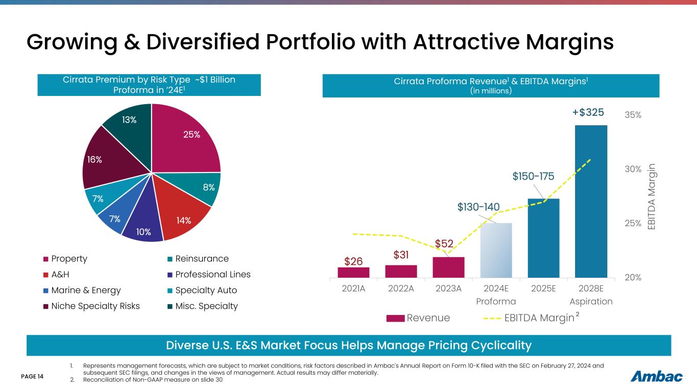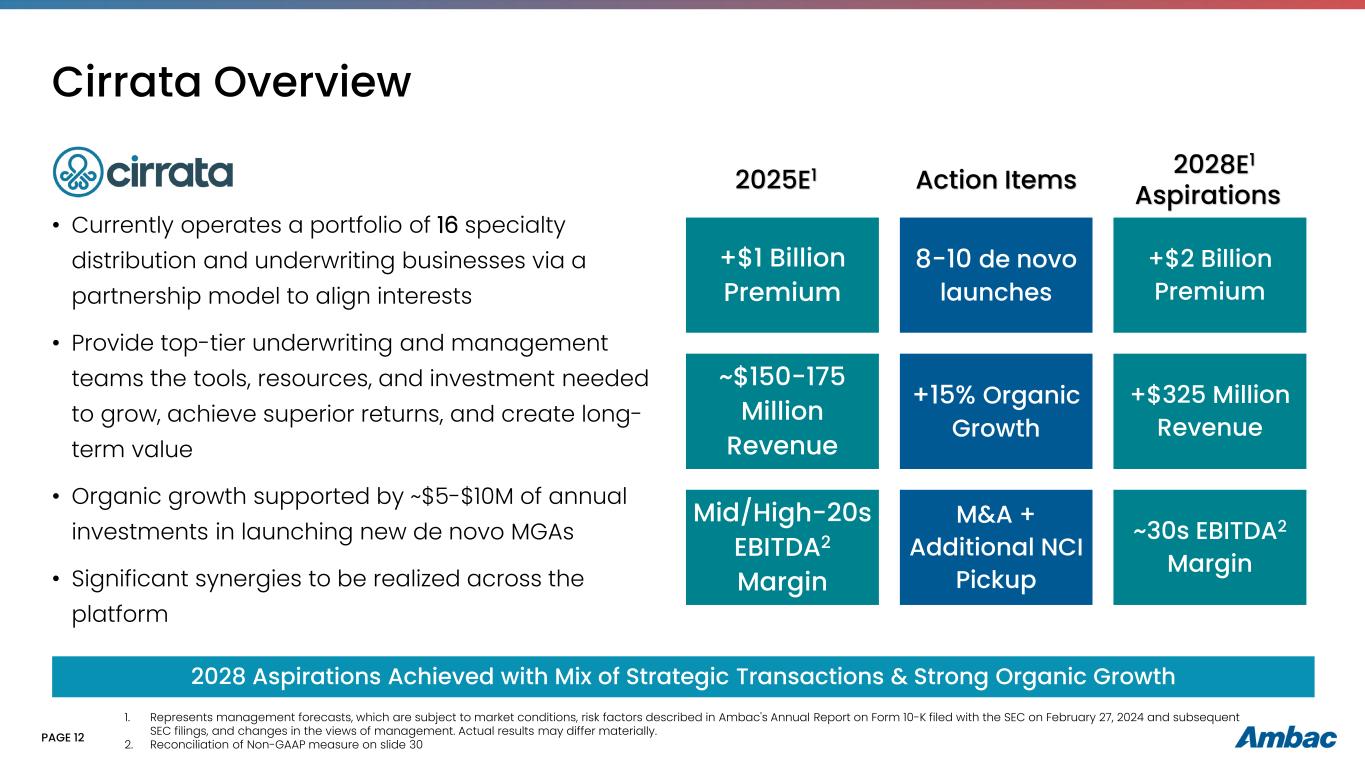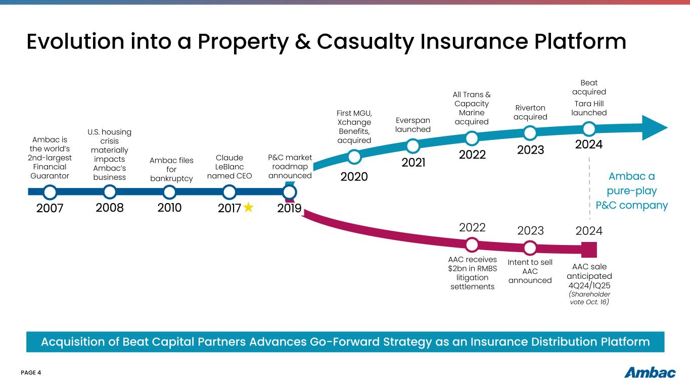 PAGE 3 • A pure-play P&C business focused on the dynamic Managing General Agent and Managing General Underwriter ("MGA") sector following the completion of the sale of Legacy Financial Guarantee business • Positioned to be a premier destination for specialty programs & MGAs • Over ~$1.4 billion1 of premium estimated for 2025 across a diversified portfolio of products and risk classes • Well positioned to compete and grow in the specialty program space • A high-growth, global, and predominantly fee-based business • Opportunity for direct investment into the attractive MGA sector • ~$70-$80 million1 of EBITDA in ’28E from a scalable and high margin business • $50 million share repurchase program to be implemented post AAC sale Our Vision Ambac is a Leading Specialty Insurance Risk Distributor and Underwriting Manager Ambac 2025 Diversified and growing platform Compelling value narrative 1. Includes Cirrata (inclusive of Beat) and Everspan Gross Written Premiums and based on management estimates, which are subject to market conditions, risk factors described in Ambac's Annual Report on Form 10-K filed with the SEC on February 27, 2024, and subsequent reports filed with the SEC, and changes in the views of management. Actual results may differ materially