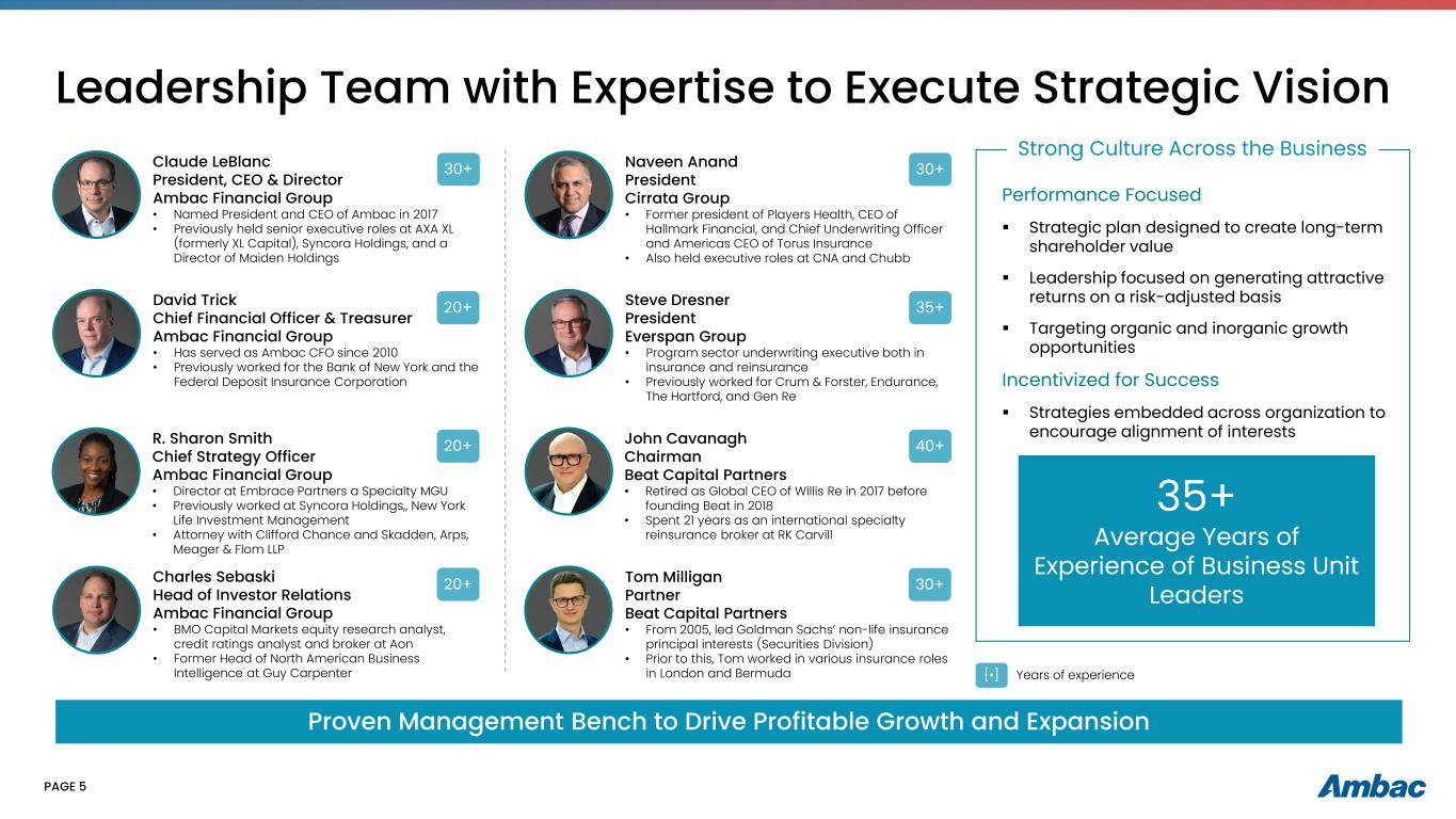 PAGE 4 Evolution into a Property & Casualty Insurance Platform 2007 2008 2019 Ambac is the world’s 2nd-largest Financial Guarantor 2021 2022 U.S. housing crisis materially impacts Ambac’s business Claude LeBlanc named CEO P&C market roadmap announced Everspan launched First MGU, Xchange Benefits, acquired 2017 2023 2024 All Trans & Capacity Marine acquired Riverton acquired Beat acquired Tara Hill launched 2020 AAC receives $2bn in RMBS litigation settlements Intent to sell AAC announced AAC sale anticipated 4Q24/1Q25 (Shareholder vote Oct. 16) Ambac a pure-play P&C company 20232022 2024 Acquisition of Beat Capital Partners Advances Go-Forward Strategy as an Insurance Distribution Platform 2010 Ambac files for bankruptcy