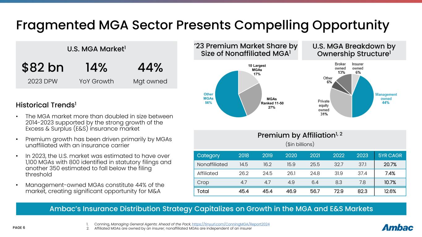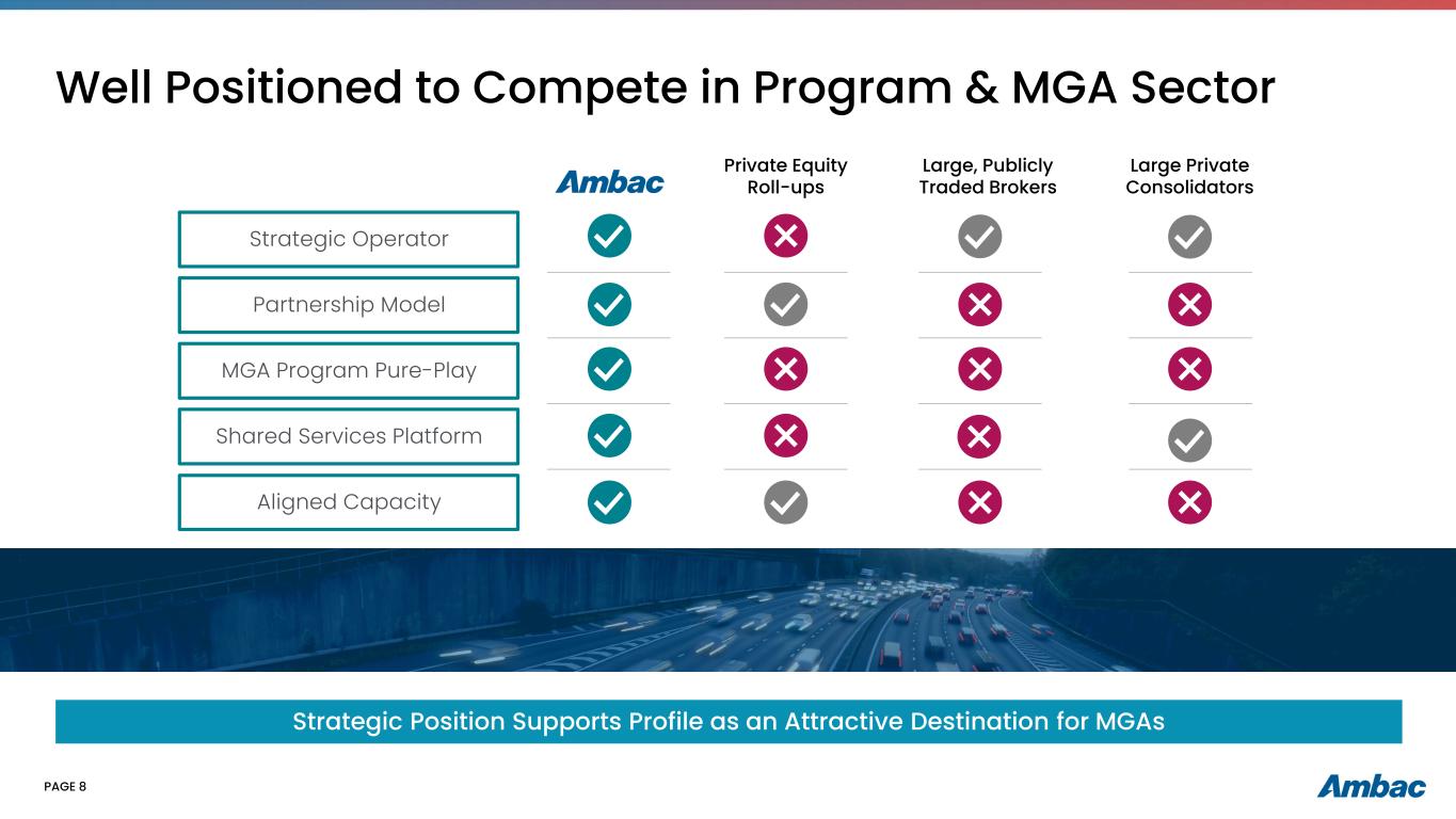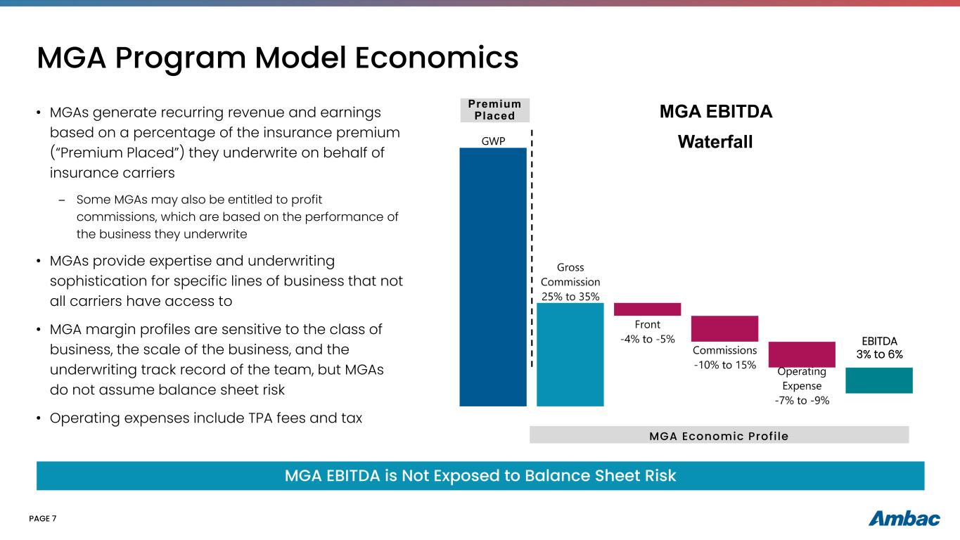 PAGE 6 Historical Trends1 • The MGA market more than doubled in size between 2014-2023 supported by the strong growth of the Excess & Surplus (E&S) insurance market • Premium growth has been driven primarily by MGAs unaffiliated with an insurance carrier • In 2023, the U.S. market was estimated to have over 1,100 MGAs with 800 identified in statutory filings and another 350 estimated to fall below the filing threshold • Management-owned MGAs constitute 44% of the market, creating significant opportunity for M&A Premium by Affiliation1, 2 ($in billions) ’23 Premium Market Share by Size of Nonaffiliated MGA1 U.S. MGA Breakdown by Ownership Structure1 Fragmented MGA Sector Presents Compelling Opportunity U.S. MGA Market1 $82 bn 2023 DPW 14% YoY Growth 44% Mgt owned Category 2018 2019 2020 2021 2022 2023 5YR CAGR Nonaffiliated 14.5 16.2 15.9 25.5 32.7 37.1 20.7% Affiliated 26.2 24.5 26.1 24.8 31.9 37.4 7.4% Crop 4.7 4.7 4.9 6.4 8.3 7.8 10.7% Total 45.4 45.4 46.9 56.7 72.9 82.3 12.6% Ambac’s Insurance Distribution Strategy Capitalizes on Growth in the MGA and E&S Markets 1. Conning, Managing General Agents: Ahead of the Pack, https://tinyurl.com/ConningMGA/Report2024 2. Affiliated MGAs are owned by an insurer; nonaffiliated MGAs are independent of an insurer 10 Largest MGAs 17% MGAs Ranked 11-50 27% Other MGAs 56%