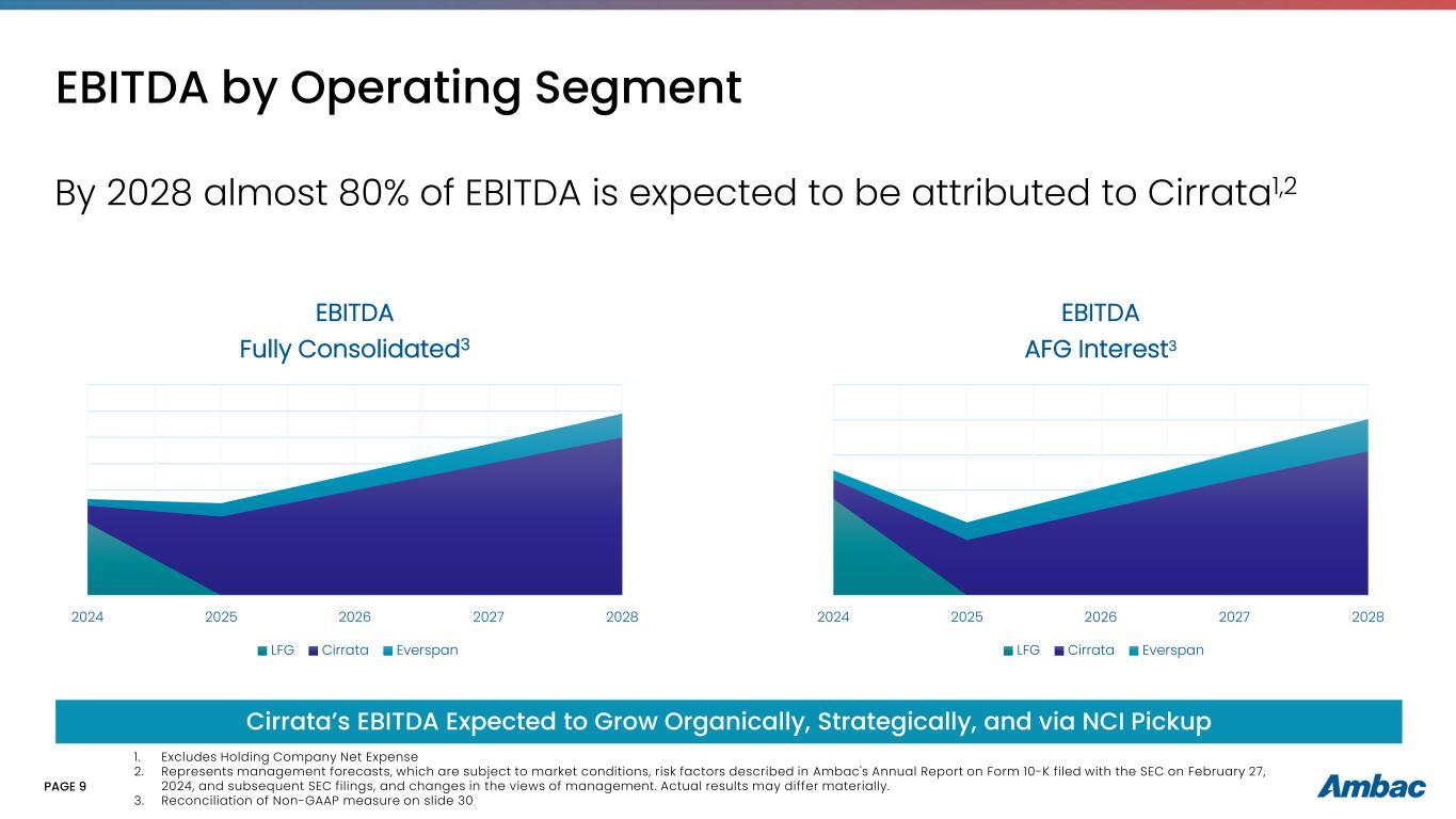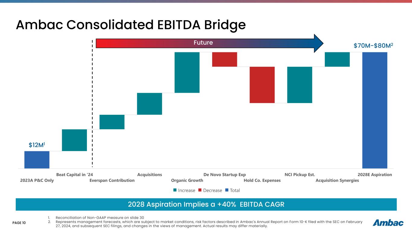 PAGE 9 EBITDA by Operating Segment 1. Excludes Holding Company Net Expense 2. Represents management forecasts, which are subject to market conditions, risk factors described in Ambac's Annual Report on Form 10-K filed with the SEC on February 27, 2024, and subsequent SEC filings, and changes in the views of management. Actual results may differ materially. 3. Reconciliation of Non-GAAP measure on slide 30 By 2028 almost 80% of EBITDA is expected to be attributed to Cirrata1,2 2024 2025 2026 2027 2028 EBITDA Fully Consolidated3 LFG Cirrata Everspan 2024 2025 2026 2027 2028 EBITDA AFG Interest3 LFG Cirrata Everspan Cirrata’s EBITDA Expected to Grow Organically, Strategically, and via NCI Pickup