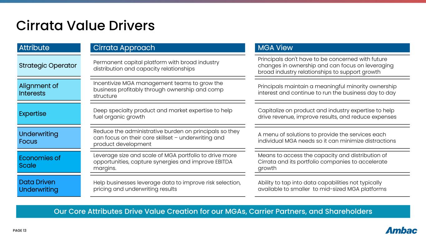 PAGE 12 1. Represents management forecasts, which are subject to market conditions, risk factors described in Ambac's Annual Report on Form 10-K filed with the SEC on February 27, 2024 and subsequent SEC filings, and changes in the views of management. Actual results may differ materially. 2. Reconciliation of Non-GAAP measure on slide 30 • Currently operates a portfolio of 16 specialty distribution and underwriting businesses via a partnership model to align interests • Provide top-tier underwriting and management teams the tools, resources, and investment needed to grow, achieve superior returns, and create long- term value • Organic growth supported by ~$5-$10M of annual investments in launching new de novo MGAs • Significant synergies to be realized across the platform Cirrata Overview +$1 Billion Premium 8-10 de novo launches +$2 Billion Premium ~$150-175 Million Revenue +15% Organic Growth +$325 Million Revenue Mid/High-20s EBITDA2 Margin M&A + Additional NCI Pickup ~30s EBITDA2 Margin 2025E1 Action Items 2028E1 Aspirations 2028 Aspirations Achieved with Mix of Strategic Transactions & Strong Organic Growth