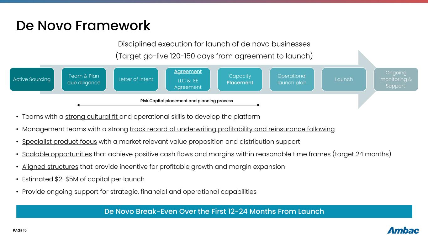 PAGE 14 25% 8% 14% 10% 7% 7% 16% 13% Property Reinsurance A&H Professional Lines Marine & Energy Specialty Auto Niche Specialty Risks Misc. Specialty 1. Represents management forecasts, which are subject to market conditions, risk factors described in Ambac's Annual Report on Form 10-K filed with the SEC on February 27, 2024 and subsequent SEC filings, and changes in the views of management. Actual results may differ materially. 2. Reconciliation of Non-GAAP measure on slide 30 Growing & Diversified Portfolio with Attractive Margins Diverse U.S. E&S Market Focus Helps Manage Pricing Cyclicality Cirrata Premium by Risk Type ~$1 Billion Proforma in ’24E1 $26 $31 $52 $130-140 $150-175 $375 20% 25% 30% 35% 2021A 2022A 2023A 2024E Proforma 2025E 2028E Aspiration EB IT D A M ar gi n Revenue EBITDA Margin +$325 Cirrata Proforma Revenue1 & EBITDA Margins1 (in millions) 2