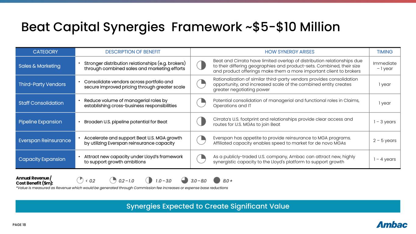 PAGE 18 CATEGORY DESCRIPTION OF BENEFIT HOW SYNERGY ARISES TIMING Sales & Marketing • Stronger distribution relationships (e.g. brokers) through combined sales and marketing efforts Beat and Cirrata have limited overlap of distribution relationships due to their differing geographies and product-sets. Combined, their size and product offerings make them a more important client to brokers Immediate – 1 year Third-Party Vendors • Consolidate vendors across portfolio and secure improved pricing through greater scale Rationalization of similar third-party vendors provides consolidation opportunity, and increased scale of the combined entity creates greater negotiating power 1 year Staff Consolidation • Reduce volume of managerial roles by establishing cross-business responsibilities Potential consolidation of managerial and functional roles in Claims, Operations and IT 1 year Pipeline Expansion • Broaden U.S. pipeline potential for Beat Cirrata’s U.S. footprint and relationships provide clear access and routes for U.S. MGAs to join Beat 1 – 3 years Everspan Reinsurance • Accelerate and support Beat U.S. MGA growth by utilizing Everspan reinsurance capacity Everspan has appetite to provide reinsurance to MGA programs. Affiliated capacity enables speed to market for de novo MGAs 2 – 5 years Capacity Expansion • Attract new capacity under Lloyd‘s framework to support growth ambitions As a publicly-traded U.S. company, Ambac can attract new, highly synergistic capacity to the Lloyd's platform to support growth 1 – 4 years Annual Revenue / Cost Benefit ($m): < 0.2 0.2 – 1 .0 1 .0 – 3.0 3.0 – 8.0 8.0 + *Value is measured as Revenue which would be generated through Commission fee increases or expense base reductions Synergies Expected to Create Significant Value Beat Capital Synergies Framework ~$5-$10 Million
