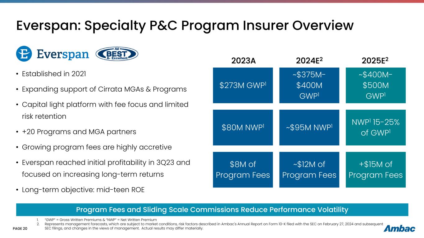 PAGE 20 • Established in 2021 • Expanding support of Cirrata MGAs & Programs • Capital light platform with fee focus and limited risk retention • +20 Programs and MGA partners • Growing program fees are highly accretive • Everspan reached initial profitability in 3Q23 and focused on increasing long-term returns • Long-term objective: mid-teen ROE Everspan: Specialty P&C Program Insurer Overview 1. “GWP” = Gross Written Premiums & “NWP” = Net Written Premium 2. Represents management forecasts, which are subject to market conditions, risk factors described in Ambac's Annual Report on Form 10-K filed with the SEC on February 27, 2024 and subsequent SEC filings, and changes in the views of management. Actual results may differ materially. Program Fees and Sliding Scale Commissions Reduce Performance Volatility 2023A 2024E2 2025E2 $273M GWP1 ~$375M- $400M GWP1 ~$400M- $500M GWP1 $80M NWP1 ~$95M NWP1 NWP1 15-25% of GWP1 $8M of Program Fees ~$12M of Program Fees +$15M of Program Fees