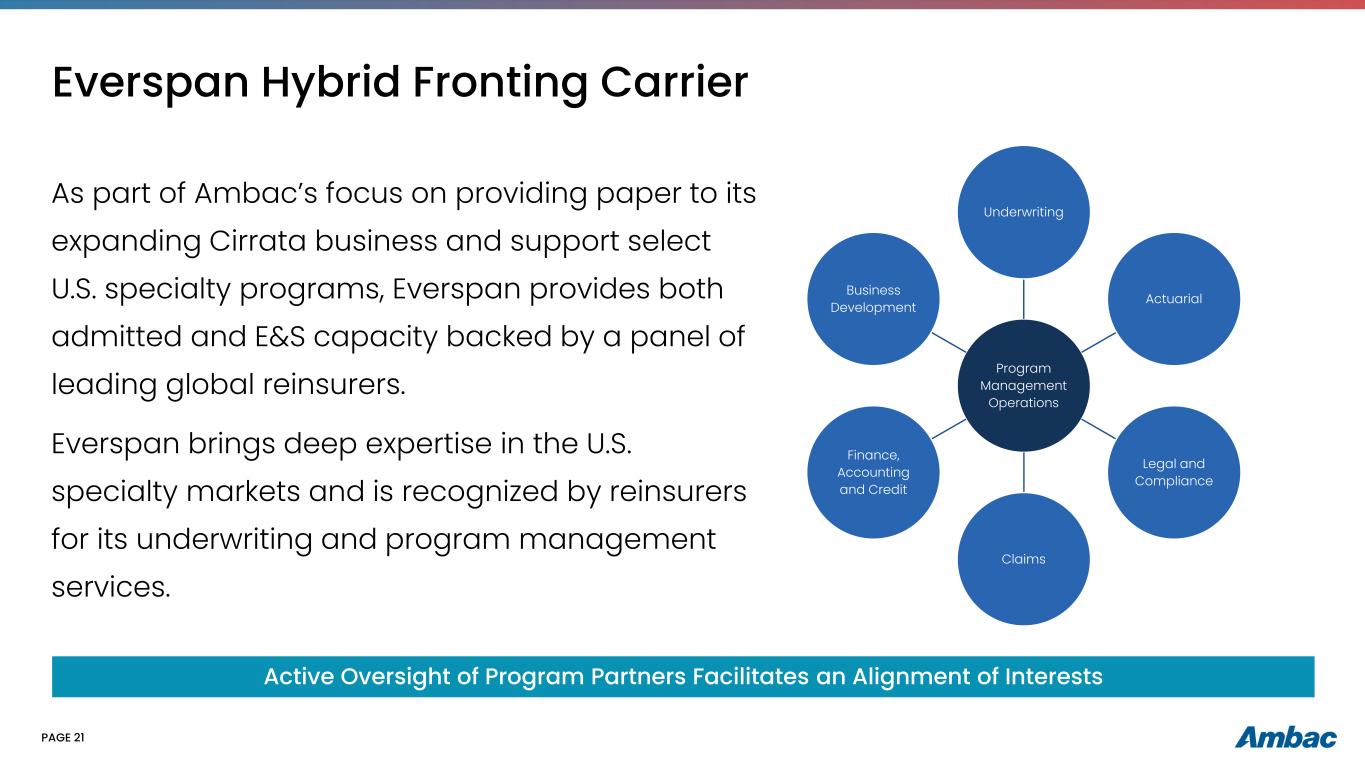 PAGE 21 As part of Ambac’s focus on providing paper to its expanding Cirrata business and support select U.S. specialty programs, Everspan provides both admitted and E&S capacity backed by a panel of leading global reinsurers. Everspan brings deep expertise in the U.S. specialty markets and is recognized by reinsurers for its underwriting and program management services. Program Management Operations Underwriting Actuarial Legal and Compliance Claims Finance, Accounting and Credit Business Development Everspan Hybrid Fronting Carrier Active Oversight of Program Partners Facilitates an Alignment of Interests