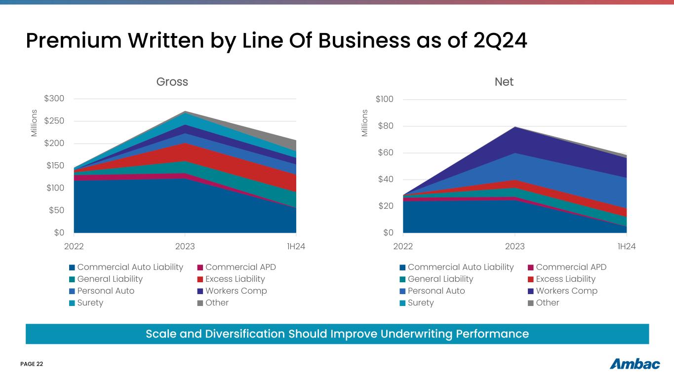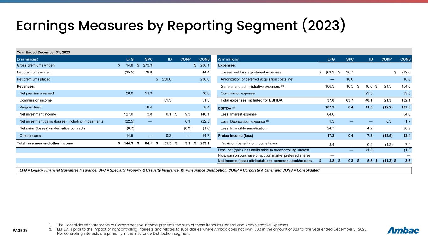 PAGE 29 Year Ended December 31, 2023 ($ in millions) LFG SPC ID CORP CONS ($ in millions) LFG SPC ID CORP CONS Gross premiums written $ 14.8 $ 273.3 $ 288.1 Expenses: Net premiums written (35.5) 79.8 44.4 Losses and loss adjustment expenses $ (69.3) $ 36.7 $ (32.6) Net premiums placed $ 230.6 230.6 Amortization of deferred acquisition costs, net — 10.6 10.6 Revenues: General and administrative expenses (1) 106.3 16.5 $ 10.6 $ 21.3 154.6 Net premiums earned 26.0 51.9 78.0 Commission expense 29.5 29.5 Commission income 51.3 51.3 Total expenses included for EBITDA 37.0 63.7 40.1 21.3 162.1 Program fees 8.4 8.4 EBITDA (2) 107.3 0.4 11.5 (12.2) 107.0 Net investment income 127.0 3.8 0.1 $ 9.3 140.1 Less: Interest expense 64.0 64.0 Net investment gains (losses), including impairments (22.5) — 0.1 (22.5) Less: Depreciation expense (1) 1.3 — — 0.3 1.7 Net gains (losses) on derivative contracts (0.7) (0.3) (1.0) Less: Intangible amortization 24.7 4.2 28.9 Other income 14.5 — 0.2 — 14.7 Pretax income (loss) 17.2 0.4 7.3 (12.5) 12.4 Total revenues and other income $ 144.3 $ 64.1 $ 51.5 $ 9.1 $ 269.1 Provision (benefit) for income taxes 8.4 — 0.2 (1.2) 7.4 Less: net (gain) loss attributable to noncontrolling interest — (1.3) (1.3) Plus: gain on purchase of auction market preferred shares — — Net income (loss) attributable to common stockholders $ 8.8 $ 0.3 $ 5.8 $ (11.3) $ 3.6 LFG = Legacy Financial Guarantee Insurance, SPC = Specialty Property & Casualty Insurance, ID = Insurance Distribution, CORP = Corporate & Other and CONS = Consolidated 1. The Consolidated Statements of Comprehensive Income presents the sum of these items as General and Administrative Expenses. 2. EBITDA is prior to the impact of noncontrolling interests and relates to subsidiaries where Ambac does not own 100% in the amount of $2.1 for the year ended December 31, 2023. Noncontrolling interests are primarily in the Insurance Distribution segment. Earnings Measures by Reporting Segment (2023)