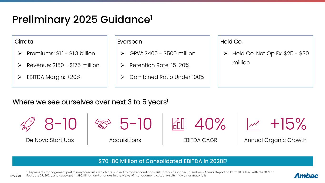PAGE 25 8-10 5-10 40% +15% De Novo Start Ups Acquisitions EBITDA CAGR Annual Organic Growth Where we see ourselves over next 3 to 5 years1 Preliminary 2025 Guidance1 1. Represents management preliminary forecasts, which are subject to market conditions, risk factors described in Ambac's Annual Report on Form 10-K filed with the SEC on February 27, 2024, and subsequent SEC filings, and changes in the views of management. Actual results may differ materially. $70-80 Million of Consolidated EBITDA in 2028E1 Cirrata Premiums: $1.1 - $1.3 billion Revenue: $150 - $175 million EBITDA Margin: +20% Everspan GPW: $400 - $500 million Retention Rate: 15-20% Combined Ratio Under 100% Hold Co. Hold Co. Net Op Ex: $25 - $30 million
