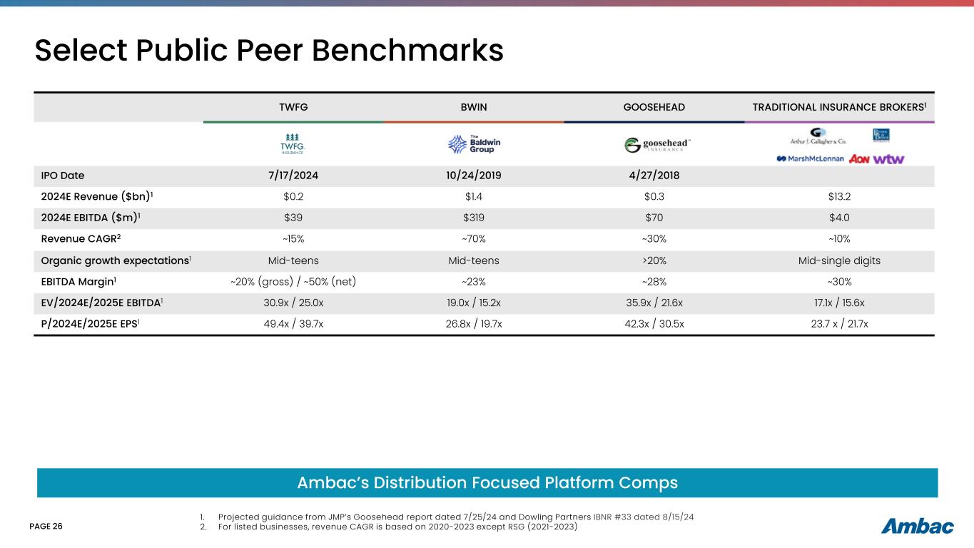PAGE 26 TWFG BWIN GOOSEHEAD TRADITIONAL INSURANCE BROKERS1 IPO Date 7/17/2024 10/24/2019 4/27/2018 2024E Revenue ($bn)1 $0.2 $1.4 $0.3 $13.2 2024E EBITDA ($m)1 $39 $319 $70 $4.0 Revenue CAGR2 ~15% ~70% ~30% ~10% Organic growth expectations1 Mid-teens Mid-teens >20% Mid-single digits EBITDA Margin1 ~20% (gross) / ~50% (net) ~23% ~28% ~30% EV/2024E/2025E EBITDA1 30.9x / 25.0x 19.0x / 15.2x 35.9x / 21.6x 17.1x / 15.6x P/2024E/2025E EPS1 49.4x / 39.7x 26.8x / 19.7x 42.3x / 30.5x 23.7 x / 21.7x Select Public Peer Benchmarks Ambac’s Distribution Focused Platform Comps 1. Projected guidance from JMP’s Goosehead report dated 7/25/24 and Dowling Partners IBNR #33 dated 8/15/24 2. For listed businesses, revenue CAGR is based on 2020-2023 except RSG (2021-2023)