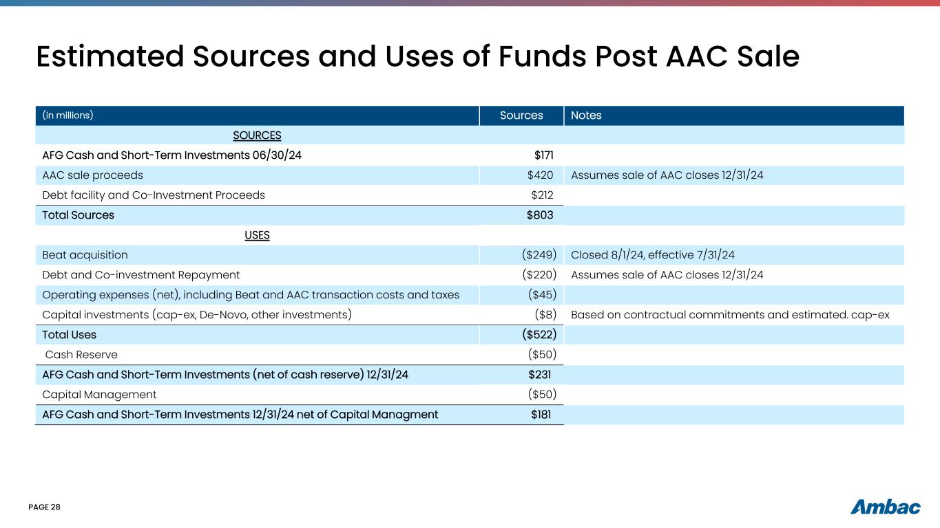 PAGE 28 (in millions) Sources Notes SOURCES AFG Cash and Short-Term Investments 06/30/24 $171 AAC sale proceeds $420 Assumes sale of AAC closes 12/31/24 Debt facility and Co-Investment Proceeds $212 Total Sources $803 USES Beat acquisition ($249) Closed 8/1/24, effective 7/31/24 Debt and Co-investment Repayment ($220) Assumes sale of AAC closes 12/31/24 Operating expenses (net), including Beat and AAC transaction costs and taxes ($45) Capital investments (cap-ex, De-Novo, other investments) ($8) Based on contractual commitments and estimated. cap-ex Total Uses ($522) Cash Reserve ($50) AFG Cash and Short-Term Investments (net of cash reserve) 12/31/24 $231 Capital Management ($50) AFG Cash and Short-Term Investments 12/31/24 net of Capital Managment $181 Estimated Sources and Uses of Funds Post AAC Sale
