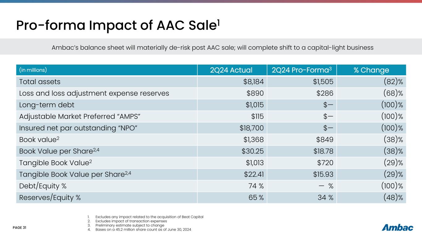 PAGE 31 1. Excludes any impact related to the acquisition of Beat Capital 2. Excludes impact of transaction expenses 3. Preliminary estimate subject to change 4. Bases on a 45.2 million share count as of June 30, 2024 (in millions) 2Q24 Actual 2Q24 Pro-Forma3 % Change Total assets $8,184 $1,505 (82)% Loss and loss adjustment expense reserves $890 $286 (68)% Long-term debt $1,015 $— (100) % Adjustable Market Preferred “AMPS” $115 $— (100) % Insured net par outstanding “NPO” $18,700 $— (100) % Book value2 $1,368 $849 (38)% Book Value per Share2,4 $30.25 $18.78 (38)% Tangible Book Value2 $1,013 $720 (29)% Tangible Book Value per Share2,4 $22.41 $15.93 (29)% Debt/Equity % 74 % — % (100) % Reserves/Equity % 65 % 34 % (48)% Ambac’s balance sheet will materially de-risk post AAC sale; will complete shift to a capital-light business Pro-forma Impact of AAC Sale1