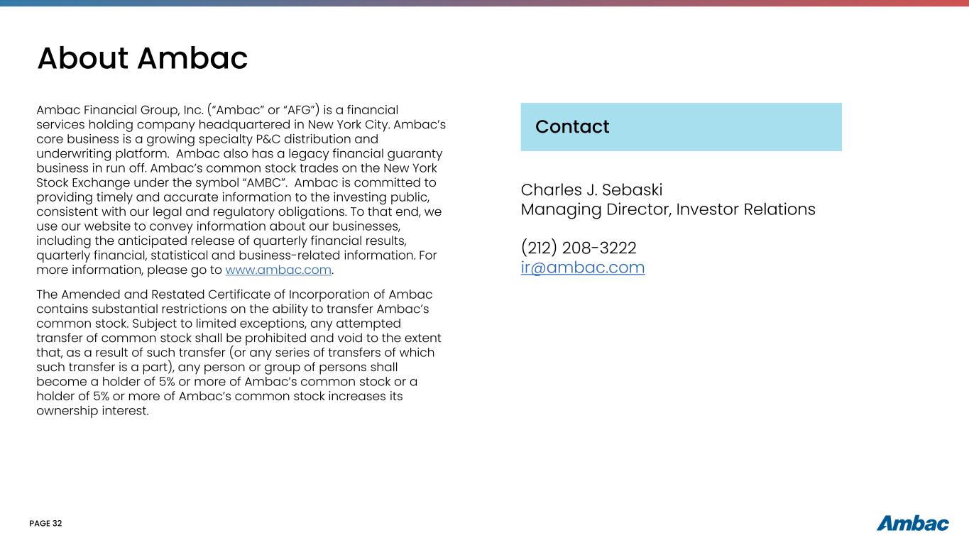 PAGE 32 Ambac Financial Group, Inc. (“Ambac” or “AFG”) is a financial services holding company headquartered in New York City. Ambac’s core business is a growing specialty P&C distribution and underwriting platform. Ambac also has a legacy financial guaranty business in run off. Ambac’s common stock trades on the New York Stock Exchange under the symbol “AMBC”. Ambac is committed to providing timely and accurate information to the investing public, consistent with our legal and regulatory obligations. To that end, we use our website to convey information about our businesses, including the anticipated release of quarterly financial results, quarterly financial, statistical and business-related information. For more information, please go to www.ambac.com. The Amended and Restated Certificate of Incorporation of Ambac contains substantial restrictions on the ability to transfer Ambac’s common stock. Subject to limited exceptions, any attempted transfer of common stock shall be prohibited and void to the extent that, as a result of such transfer (or any series of transfers of which such transfer is a part), any person or group of persons shall become a holder of 5% or more of Ambac’s common stock or a holder of 5% or more of Ambac’s common stock increases its ownership interest. Charles J. Sebaski Managing Director, Investor Relations (212) 208-3222 ir@ambac.com About Ambac Contact