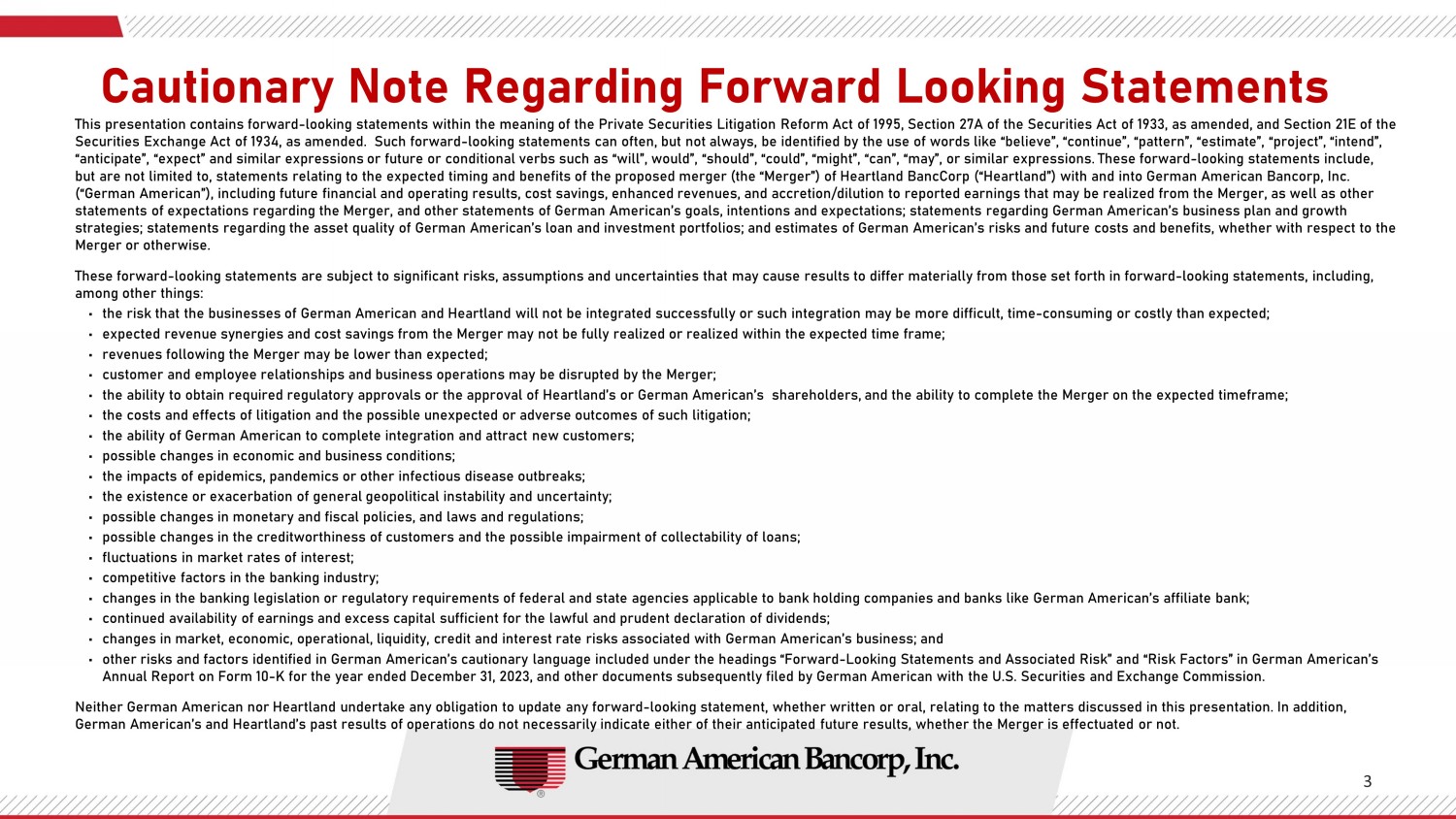 | · | the ability to obtain required regulatory approvals or the approval of Heartland’s or German American’s shareholders, and the ability to complete the Merger on the expected timeframe; |