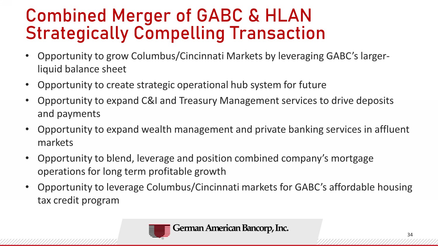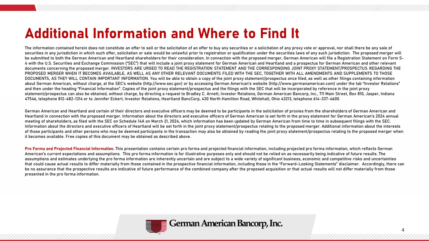 Communications in this Report do not constitute an offer to sell or the solicitation of an offer to buy any securities or a solicitation of any proxy vote or approval, nor shall there be any sale of securities in any jurisdiction in which such offer, solicitation or sale would be unlawful prior to registration or qualification under the securities laws of any such jurisdiction. The proposed Merger will be submitted to both the German American and Heartland shareholders for their consideration. In connection with the proposed Merger, German American will file a Registration Statement on Form S-4 with the SEC that will include a joint proxy statement for German American and Heartland and a prospectus for German American, and other relevant documents concerning the proposed Merger. INVESTORS ARE URGED TO READ THE REGISTRATION STATEMENT AND THE CORRESPONDING JOINT PROXY STATEMENT/PROSPECTUS REGARDING THE PROPOSED MERGER WHEN IT BECOMES AVAILABLE, AS WELL AS ANY OTHER RELEVANT DOCUMENTS FILED WITH THE SEC, TOGETHER WITH ALL AMENDMENTS AND SUPPLEMENTS TO THOSE DOCUMENTS, AS THEY WILL CONTAIN IMPORTANT INFORMATION. You will be able to obtain a copy of the joint proxy statement/prospectus once filed, as well as other filings containing information about German American, without charge, at the SEC’s website (http://www.sec.gov) or by accessing German American’s website (http://www.germanamerican.com) under the tab “Investor Relations” and then under the heading “Financial Information”. Copies of the joint proxy statement/prospectus and the filings with the SEC that will be incorporated by reference in the joint proxy statement/prospectus can also be obtained, without charge, by directing a request to Bradley C. Arnett, Investor Relations, German American Bancorp, Inc., 711 Main Street, Box 810, Jasper, Indiana 47546, telephone 812-482-1314 or to Jennifer Eckert, Investor Relations, Heartland BancCorp, 430 North Hamilton Road, Whitehall, Ohio 43213, telephone 614-337-4600.