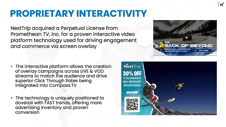 | 4. | PrometheanTV: A unique influencer-led platform that drives advertising revenue and content-to-commerce. We recently secured a perpetual license with Promethean TV, Inc., the developer of the Ignite TV interactive video platform. This technology will power Compass.TV and video content on Travel Magazine/MyBucketList, allowing for targeted advertising via video overlays, enabling viewers to purchase travel directly from their screens. This integration is designed to enhance customer engagement, drive ad-supported revenue, and increase travel transactions. |