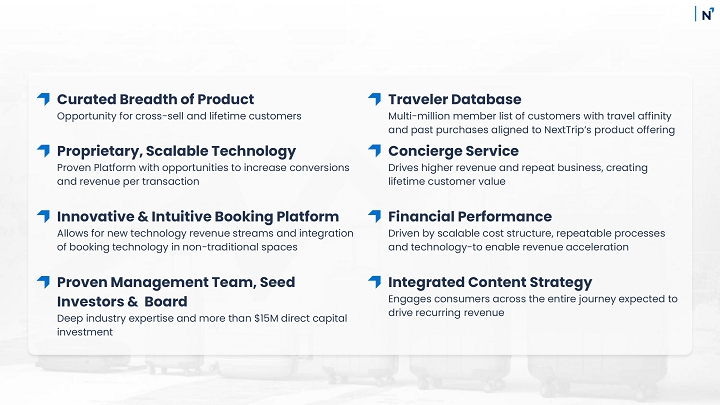 | ● | NextTrip Travel brings travel solutions and a proprietary booking engine that allows customers to book customized travel, including vacation packages, airline tickets, hotel reservations, tours and activities, curated journeys, wellness, business and group travel. Additionally, we are developing a travel agent portal to drive bookings and travel agent brand loyalty across the leisure space. | |