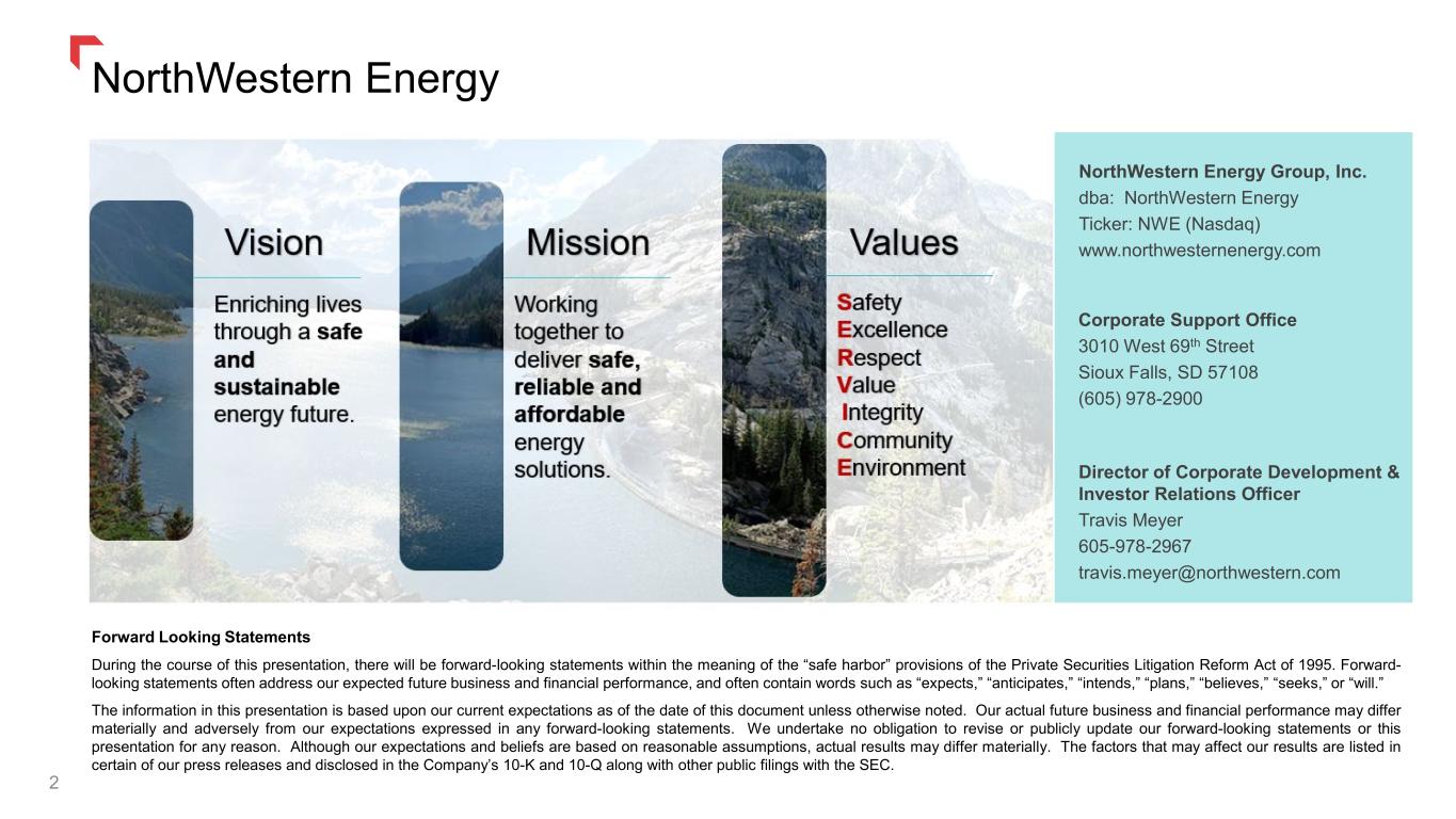 NorthWestern Energy 2 Forward Looking Statements During the course of this presentation, there will be forward-looking statements within the meaning of the “safe harbor” provisions of the Private Securities Litigation Reform Act of 1995. Forward- looking statements often address our expected future business and financial performance, and often contain words such as “expects,” “anticipates,” “intends,” “plans,” “believes,” “seeks,” or “will.” The information in this presentation is based upon our current expectations as of the date of this document unless otherwise noted. Our actual future business and financial performance may differ materially and adversely from our expectations expressed in any forward-looking statements. We undertake no obligation to revise or publicly update our forward-looking statements or this presentation for any reason. Although our expectations and beliefs are based on reasonable assumptions, actual results may differ materially. The factors that may affect our results are listed in certain of our press releases and disclosed in the Company’s 10-K and 10-Q along with other public filings with the SEC. NorthWestern Energy Group, Inc. dba: NorthWestern Energy Ticker: NWE (Nasdaq) www.northwesternenergy.com Corporate Support Office 3010 West 69th Street Sioux Falls, SD 57108 (605) 978-2900 Director of Corporate Development & Investor Relations Officer Travis Meyer 605-978-2967 travis.meyer@northwestern.com