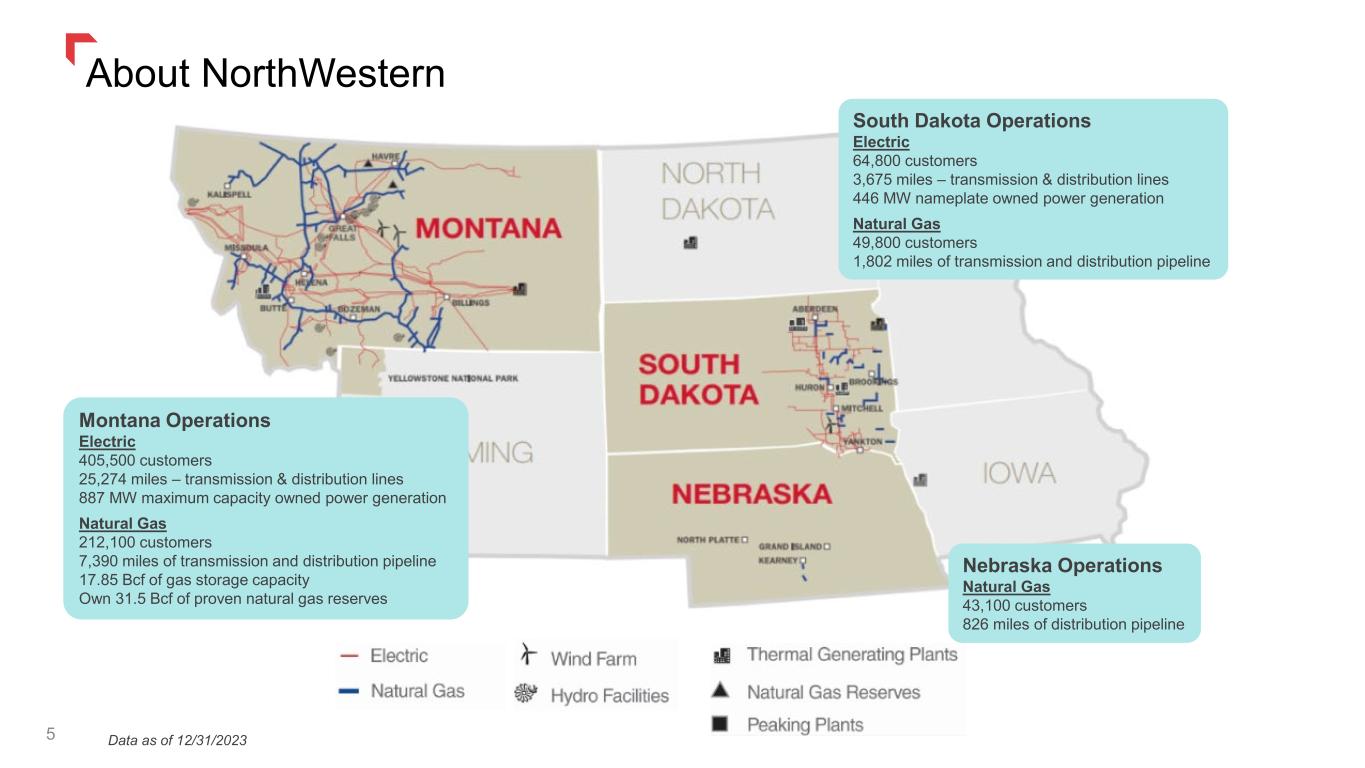 NWE – An Investment for the Long Term 4 • Approved Montana electric & natural gas and South Dakota electric rate reviews aid earnings, cash flow, and balance sheet strength • NOLs and tax credits expected to mitigate future cash tax obligations • History of consistent annual dividend growth • 100% pure electric & natural gas utility with over 100 years of operating history • Solid economic indicators in service territory • Diverse electric supply portfolio ~55% hydro, wind & solar Pure Electric & Gas Utility Solid Utility Foundation Earnings & Cash Flow Attractive Future Growth Prospects Financial Goals & Metrics Best Practices Corporate Governance • Residential electric & gas rates below national average • Solid system reliability • Low leaks per 100 miles of pipe • Solid JD Power Overall Customer Satisfaction scores • Disciplined maintenance capital investment program focus on reliability, capacity, asset life and compliance • Further opportunity for energy supply investment to meet significant capacity shortfalls • Target 4%-6% EPS growth plus dividend yield to provide competitive total return • Target dividend long-term payout ratio of 60%-70% • Target debt to capitalization ratio of 50%-55% with liquidity of $100 million or greater 5th Best Governance Score Recognized as one of America’s Greatest Workplaces
