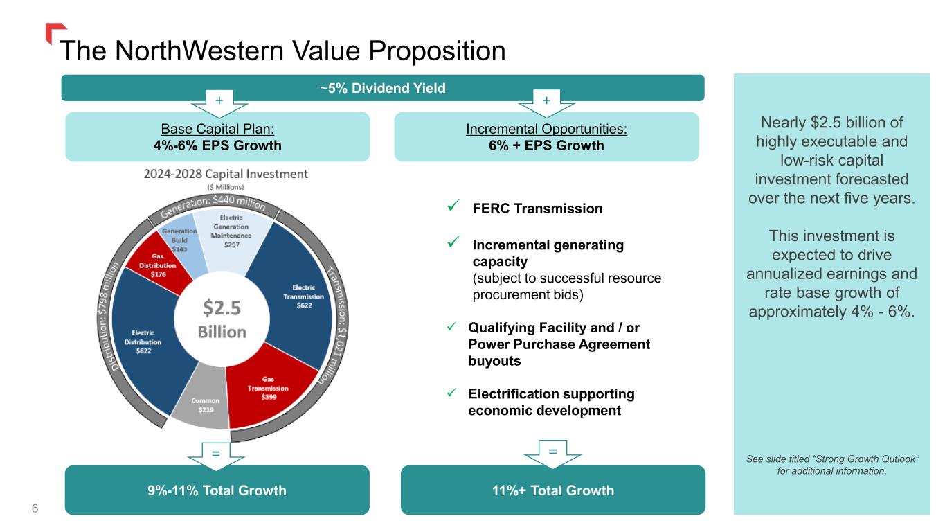 About NorthWestern 5 Montana Operations Electric 405,500 customers 25,274 miles – transmission & distribution lines 887 MW maximum capacity owned power generation Natural Gas 212,100 customers 7,390 miles of transmission and distribution pipeline 17.85 Bcf of gas storage capacity Own 31.5 Bcf of proven natural gas reserves Nebraska Operations Natural Gas 43,100 customers 826 miles of distribution pipeline Data as of 12/31/2023 South Dakota Operations Electric 64,800 customers 3,675 miles – transmission & distribution lines 446 MW nameplate owned power generation Natural Gas 49,800 customers 1,802 miles of transmission and distribution pipeline